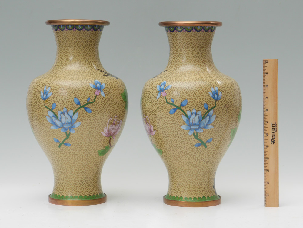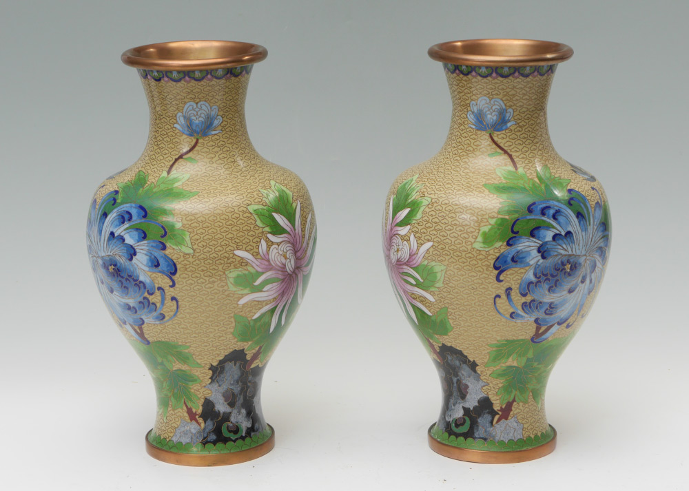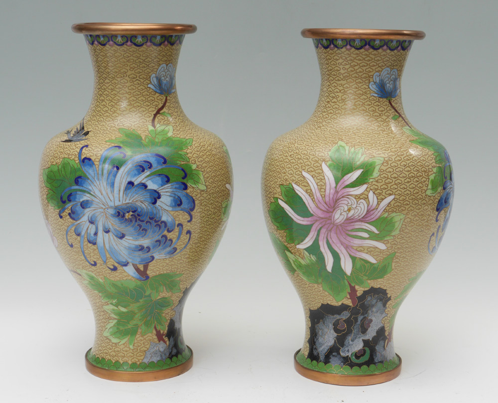 PAIR OF CHINESE CLOISONNE VASES: Baluster form, tan ground with chrysanthemum blooms, 15 1/2'' h. x 8''.