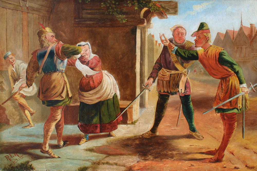 19TH CENTURY ENGLISH GENRE PAINTING: Possibly by Hillingford, Oil/Canvas, Depicts an Argument Between Several Men Armed with Swords, 20'' x 30'', encased in a carved a gilded gesso frame of the period, 27'' x 37''. Signed lower left and dated 1880.