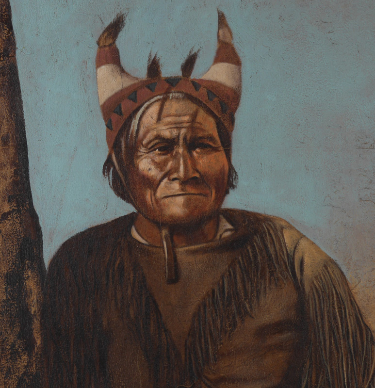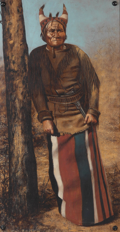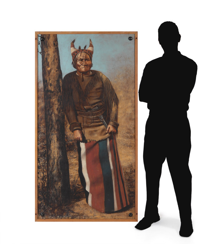 LIFE SIZE PAINTING OF AMERICAN INDIAN WARRIOR: Oil/Board, 64'' x 34'', wood frame, 66'' x 36''.
