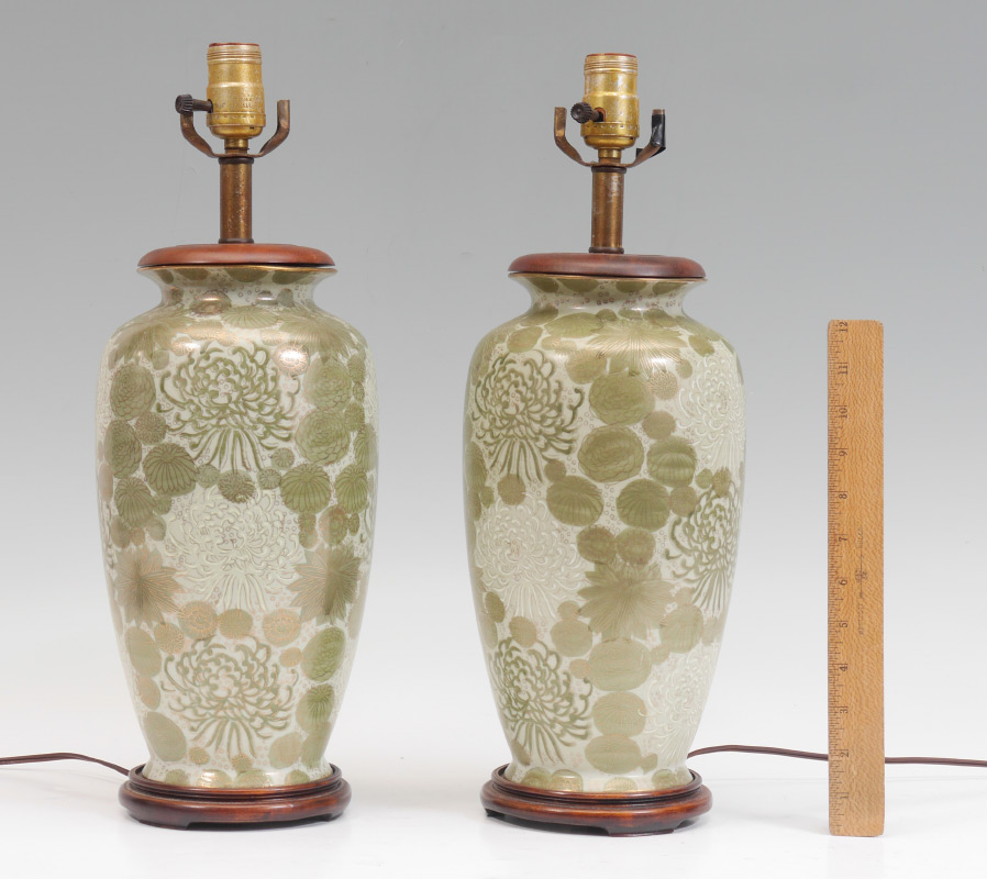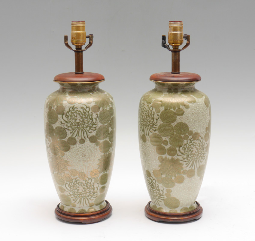 PAIR JAPANESE KUTANI LAMPS: Green and white decorated porcelain with chrysanthemum blooms motif. Wood base and top, single socket fixture. Overall 27'' h. x 6''.