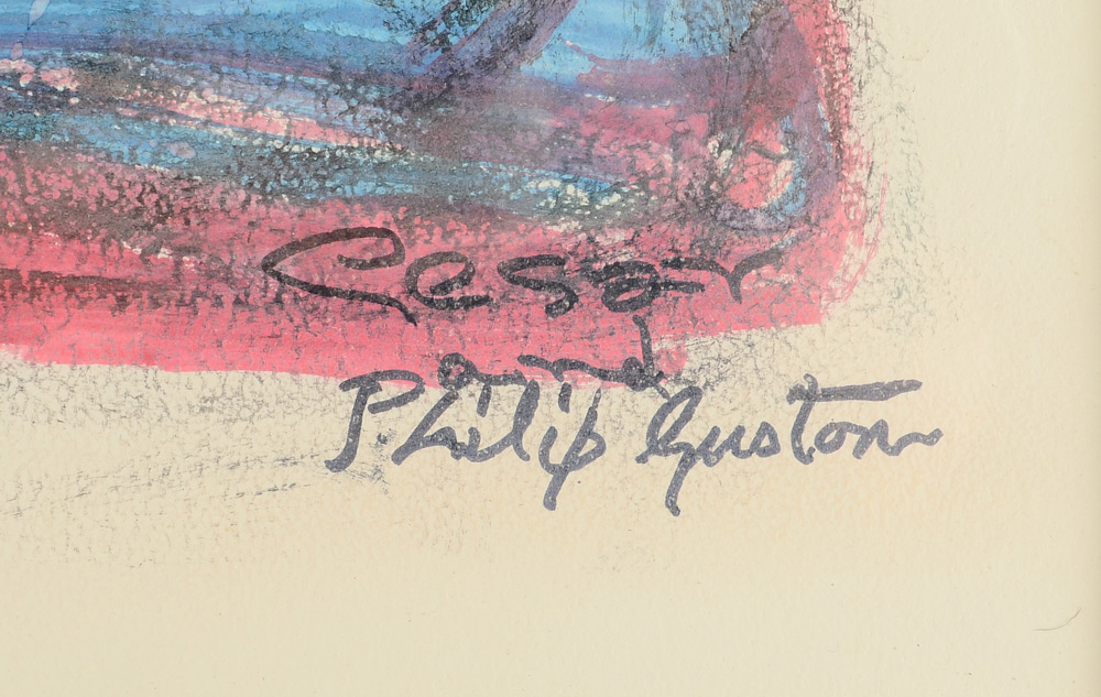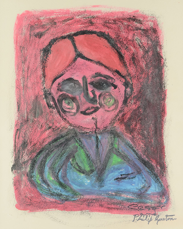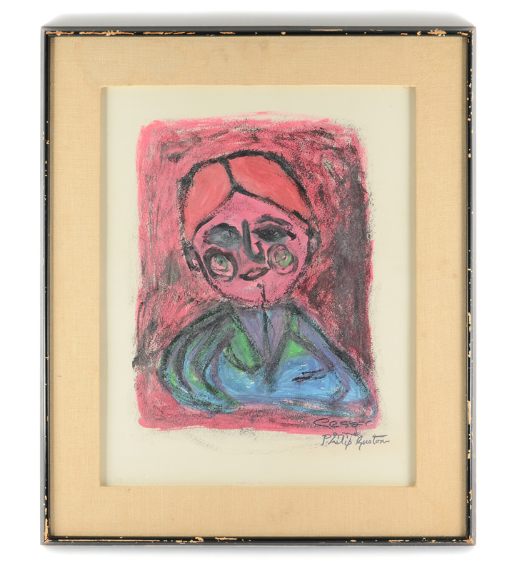PORTRAIT PAINTING SIGNED CESAR & PHILIP GUSTON: Mixed Media, Watercolor/Oil, image size 15'' x 11'', backboard painted surface measures 20'' x 16'', signed lower right, framed 25 1/2'' x 21 1/4''.