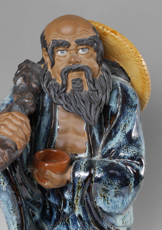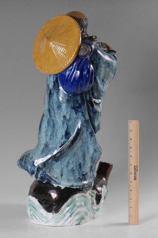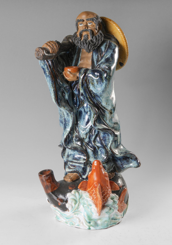CHINESE POLYCHROME CERAMIC FIGURE OF MAN: Figure of a man in flowing robes holding a staff and a cup, leaping carp at base. 24 3/4'' h. x 11'' x 11''.