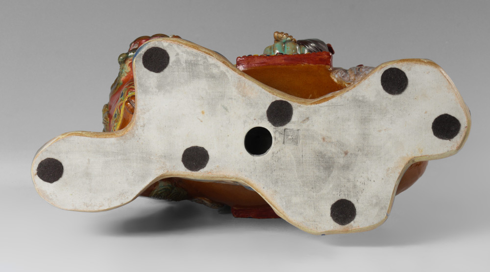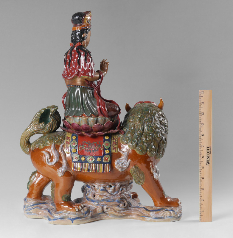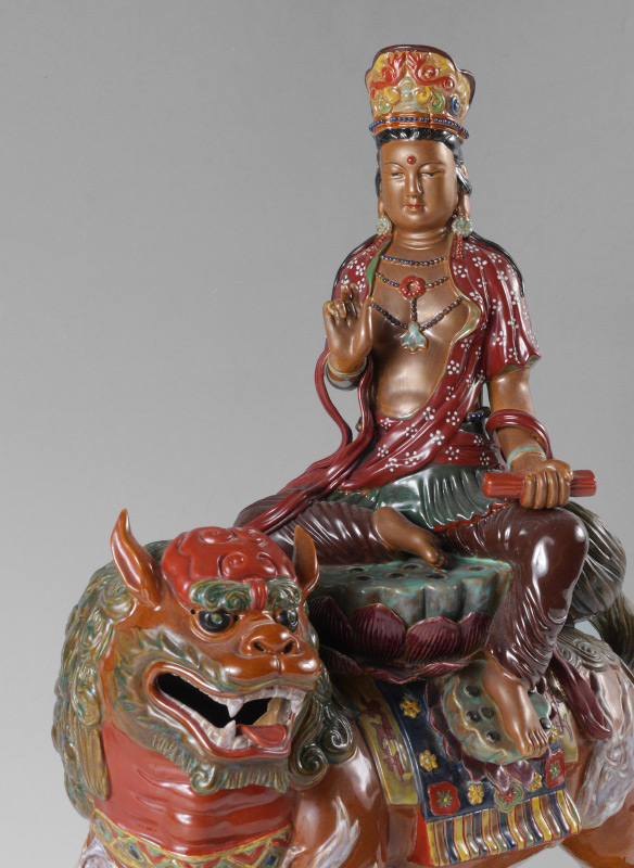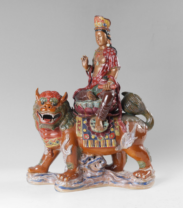 CHINESE POLYCHROME CERAMIC FIGURE OF BUDDHA: Figure of Buddha riding a foo or temple lion, measures 20'' h. x 15 1/2'' x 6 1/2''.