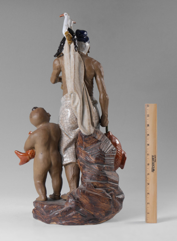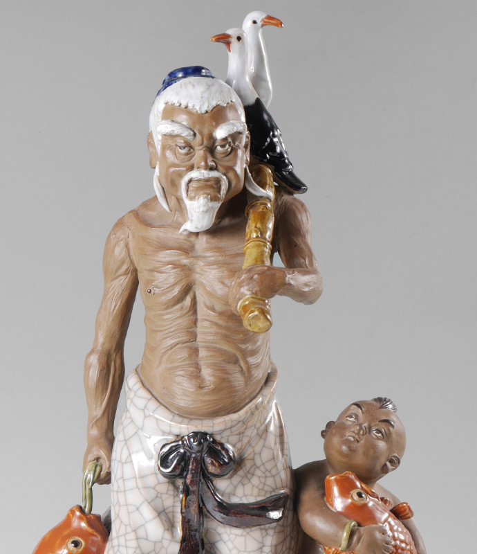 CHINESE POLYCHROME FIGURE OF ELDER FISHERMAN: Ceramic figural grouping of elder fisherman holding bamboo staff with ducks, child holding a fish. 21 3/4'' h. x 12'' x 8 1/2''
