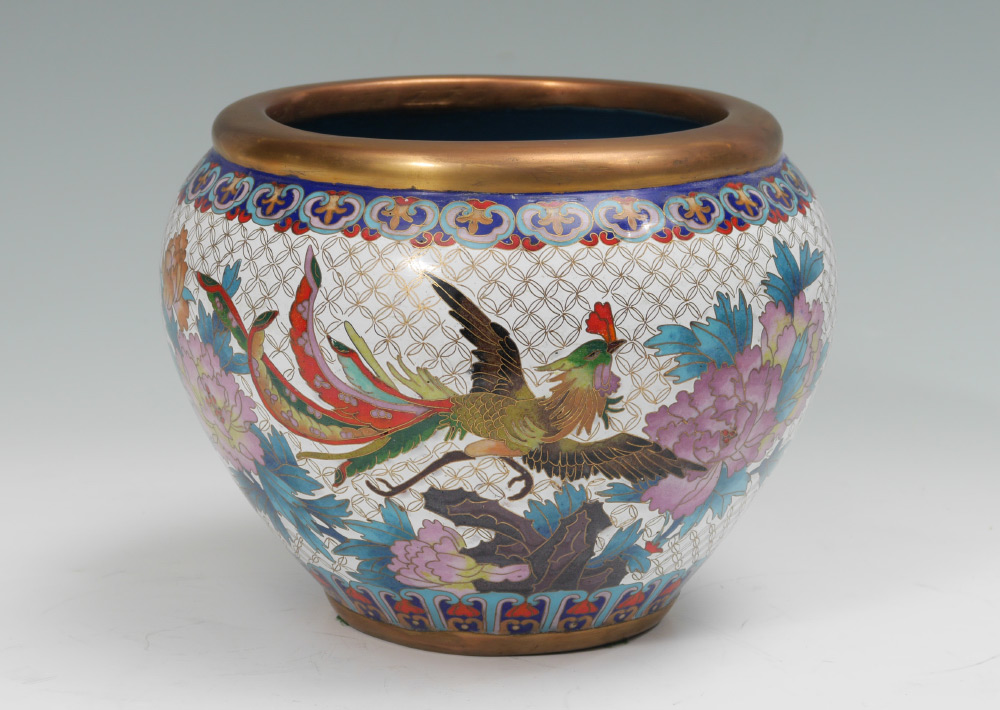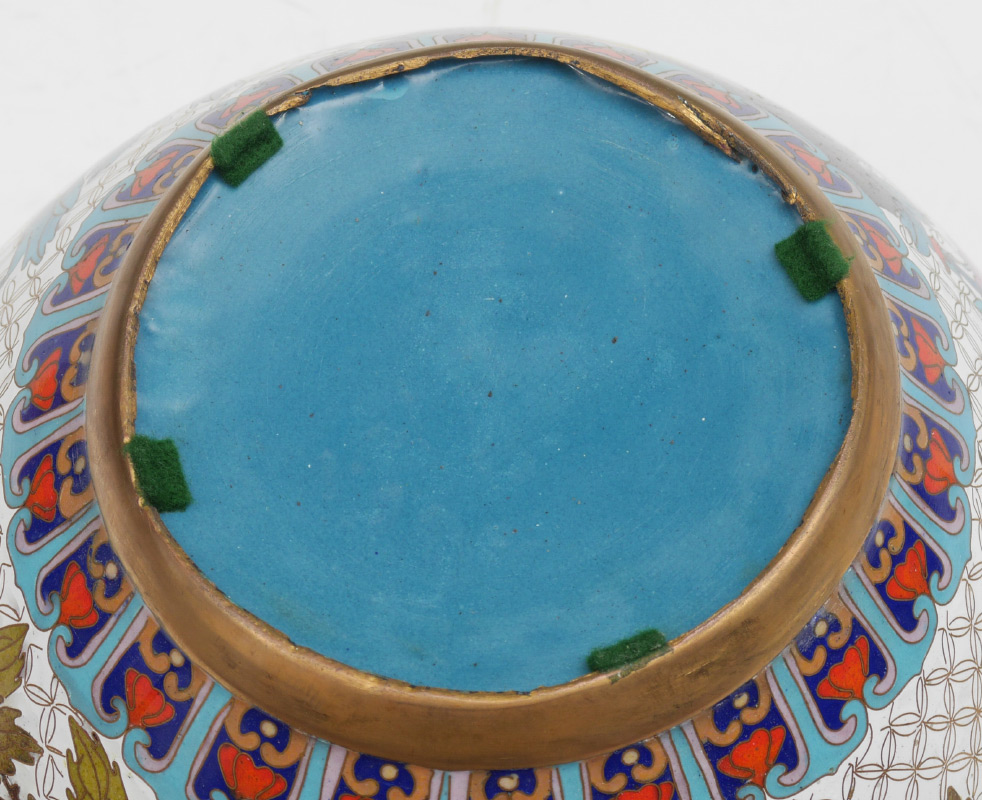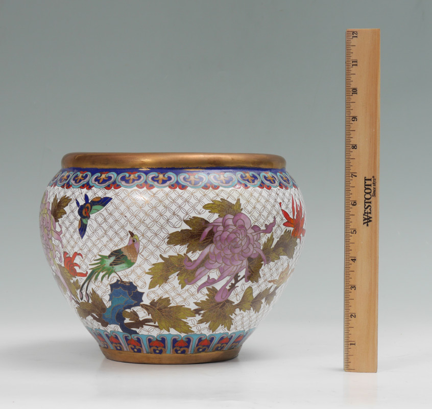 CHINESE BIRD MOTIF CLOISONNE BOWL: White ground, bird of paradise, songbird, butterfly and floral motifs, 8'' h. x 10'' dia.