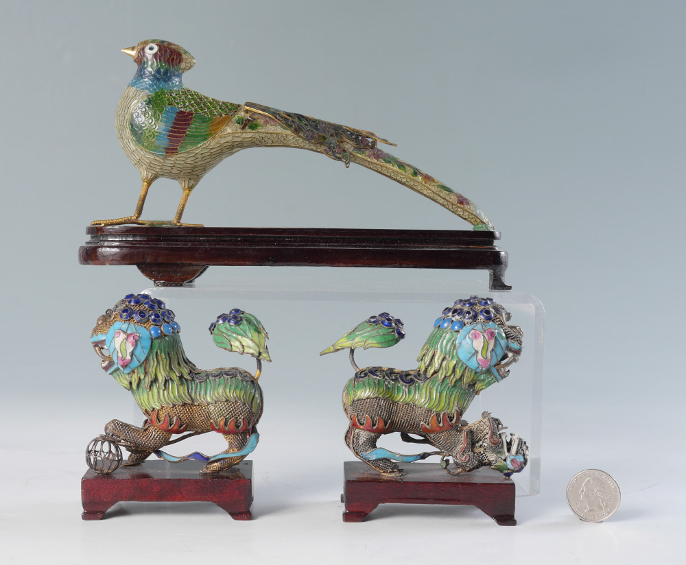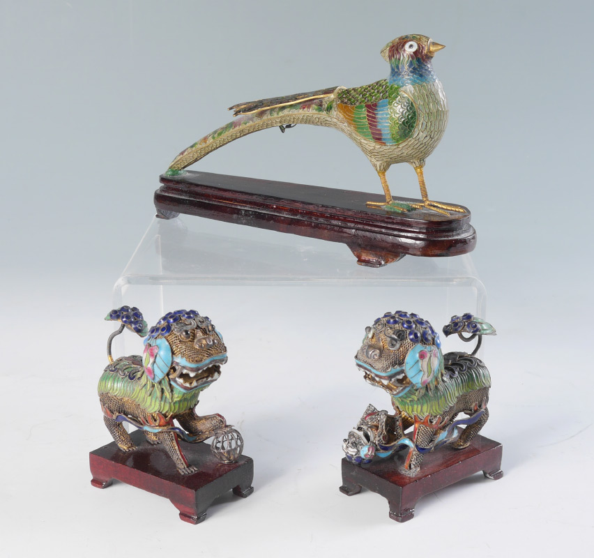 3 PIECE CHINESE CLOISONNE & PLIQUE-A-JOUR FIGURES: 3 piece total to include 1) Plique-a-jour pheasant on wood stand, measures 5'' h. x 8 1/2'' x 2''. 2-3) Cloisonne on silver? foo dogs, 4'' h. x 3 3/4'' x 1 3/4''.