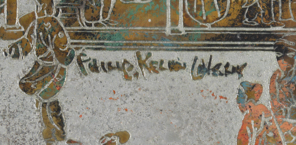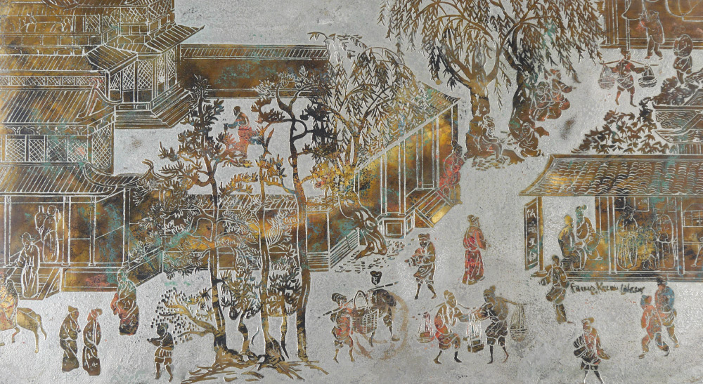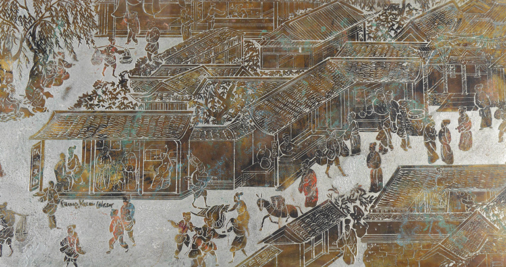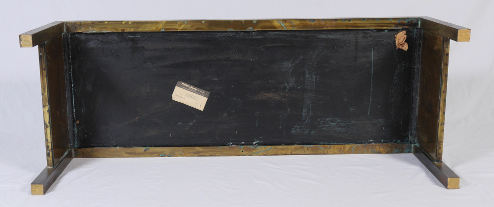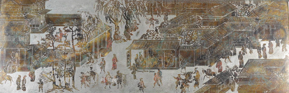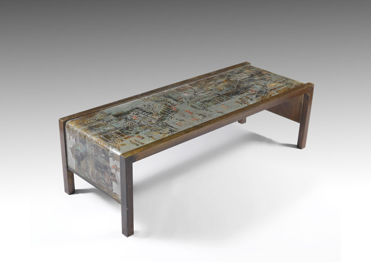 PHILIP AND KELVIN LAVERNE SPRING FESTIVAL TABLE: Polychrome decorated bronze and mixed metal table with Chinese spring festival motif. Signed on top, original shipping label under top. Measures 16'' h. x 53'' x 20''.