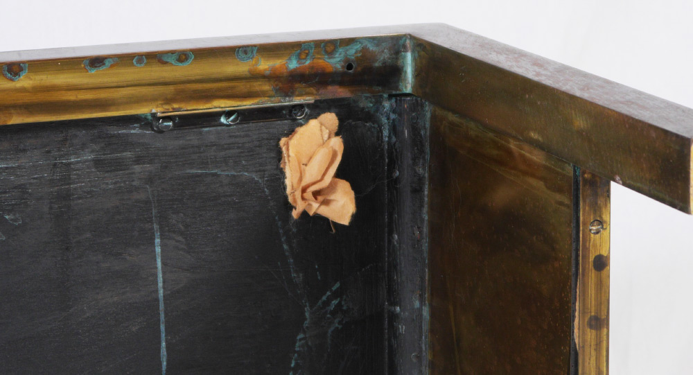 CONDITION: Oxidation spots to base of legs, minor water spots to frame of top.