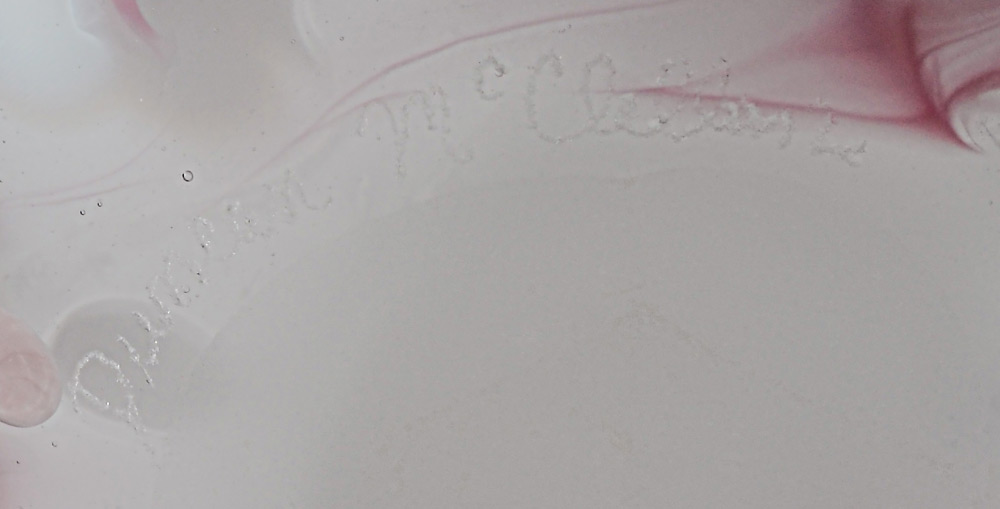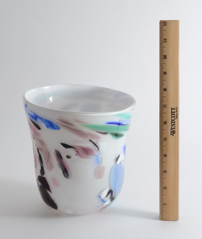 DUNCAN MCCLELLAN FUSED ART GLASS VASE: Free form vase with polychrome fused glass accents, singed on base Duncan McClellan, measures 7 1/4'' h. x 7'' dia.