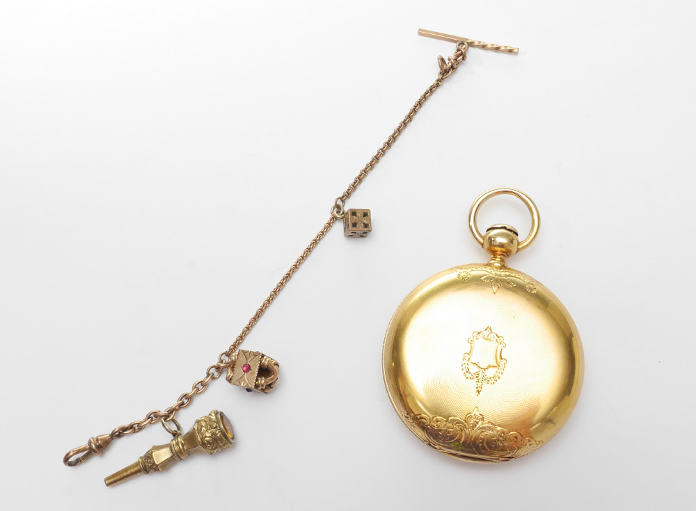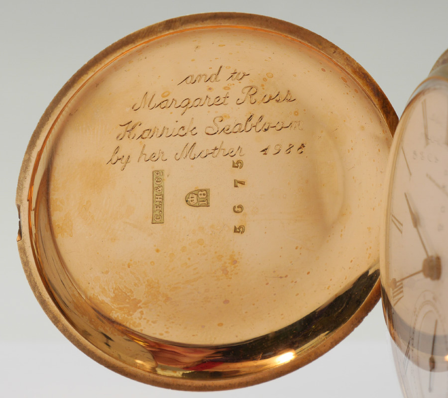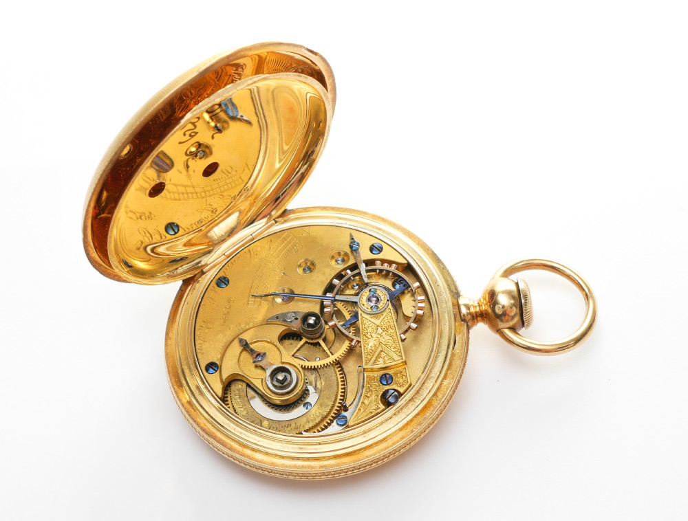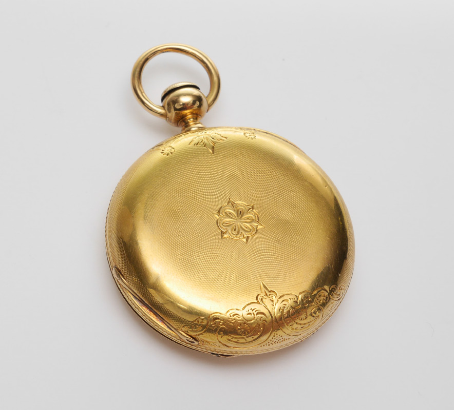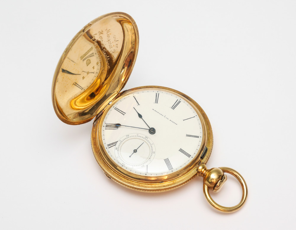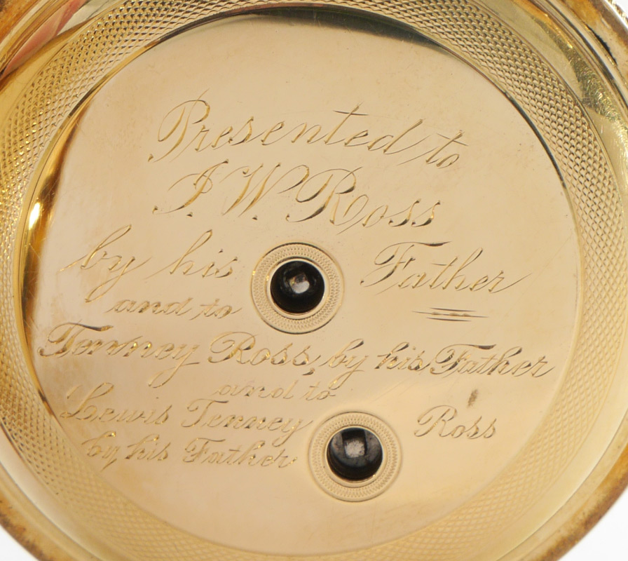 IMPORTANT 18K GOLD E. HOWARD POCKET WATCH: Mid 19th Century production, serial number 4550, size 18, 18kt engraved gold case. Watch engraved ''Presented to J. W. Ross by his father and to Tenney Ross by his father and to Lewis Tenney Ross by his father and to Tenney Kutz Ross by his father on their 21st birthdays''. The watch was originally owned by Lewis Winans Ross (December 8, 1812 - October 29, 1895) who was an Illinois attorney, merchant, and U.S. Representative from Illinois' 9th Congressional District and was given to his son John Wesley Ross (1841-1902), 1 of 12 children and also a distinguished attorney who served as President of the Washington, D. C., Board of Commissioners who in turn gave it to his oldest son Col. Tenney Ross who served as U.S. Army Chief of Staff, 79th Division, in World War I who then gave the watch to his son Lieutenant Tenney Kutz Ross who died in battle in the Korean War. Watch was finally given to Margaret Ross Karrick Seabloom by her mother in 1988.