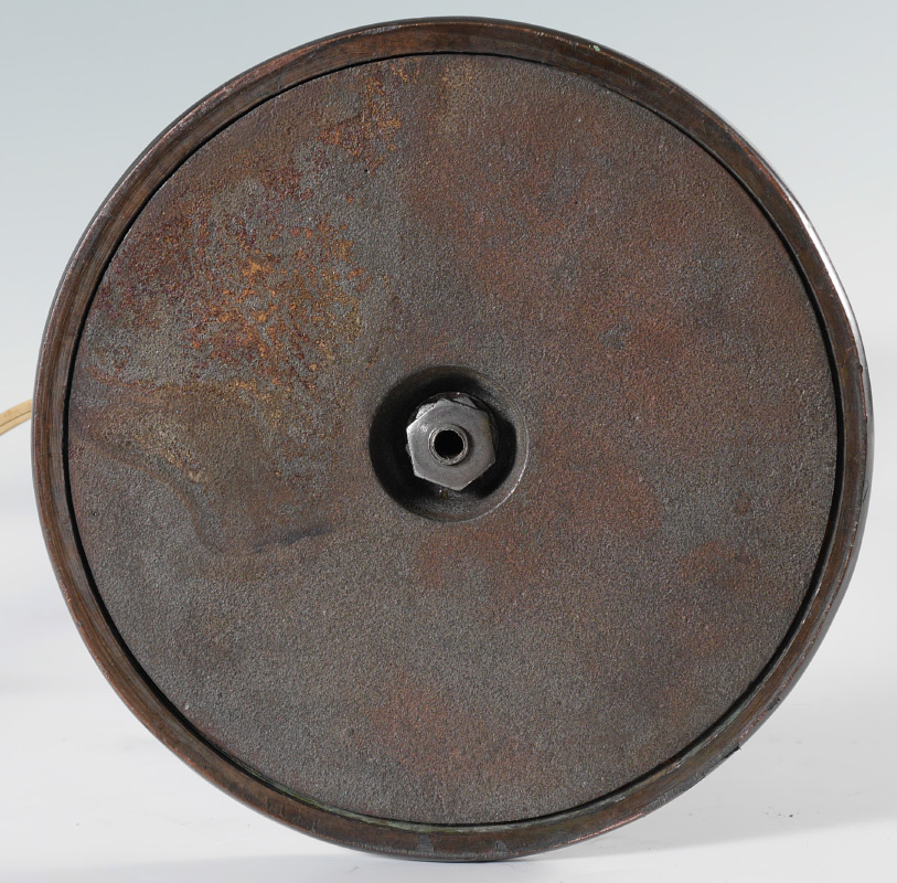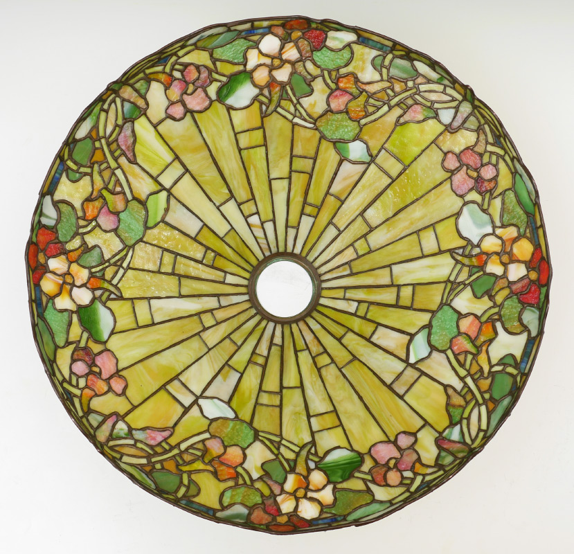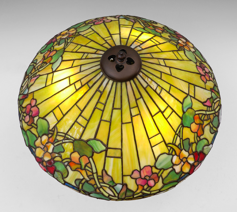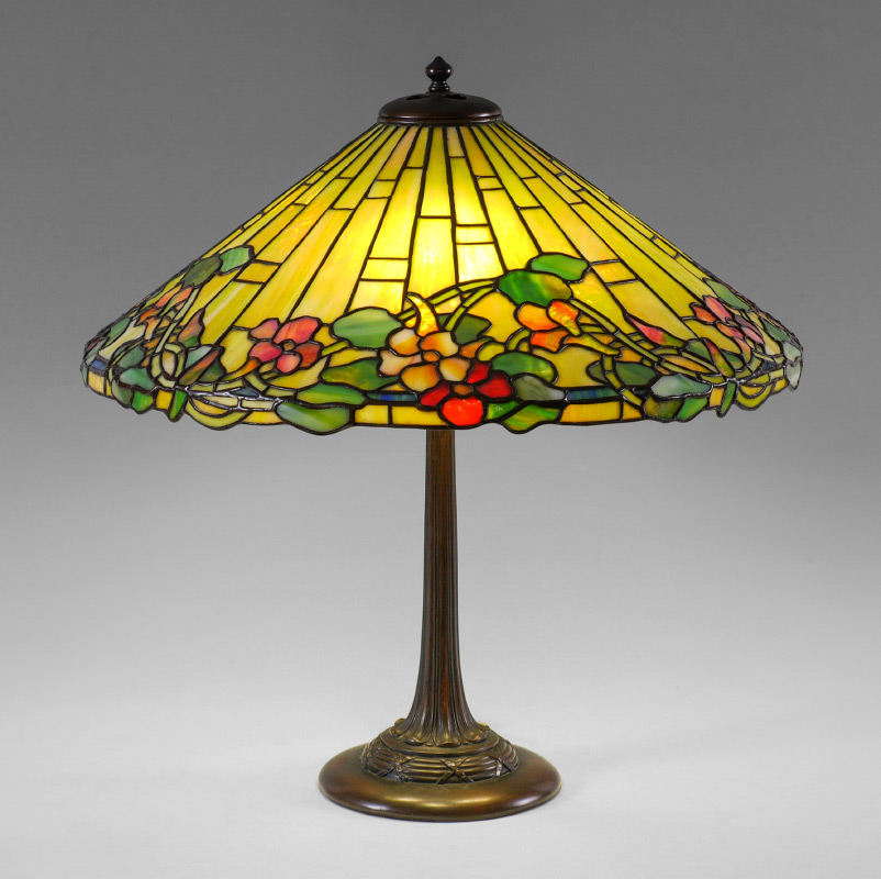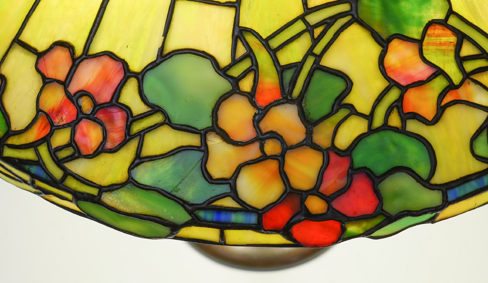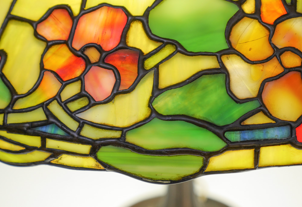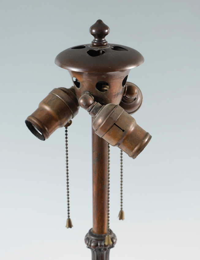 DUFFNER & KIMBERLY LEADED GLASS TABLE LAMP: Cast bronze base with banded reed motif above foot and stylized flower petals on column, triple light fixture. Measures 23 1/2'' h. x 7 3/4'' dia.. Leaded shade with green/caramel slag glass ground, shaped rim with Mandevilla (Rocktrumpet) vine motif, 7 1/2'' h. x 22 1/4'', heat cap opening 3''. No visible signature or markings.