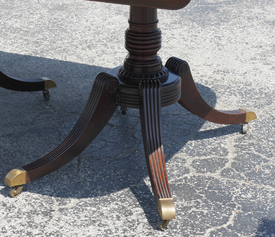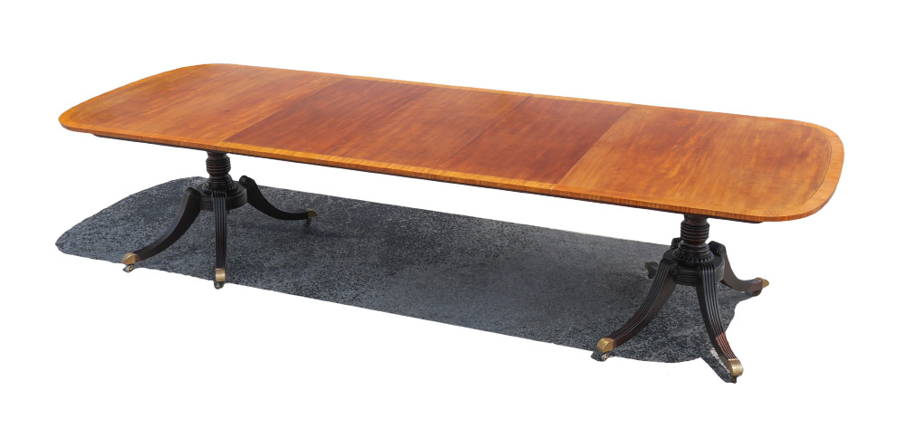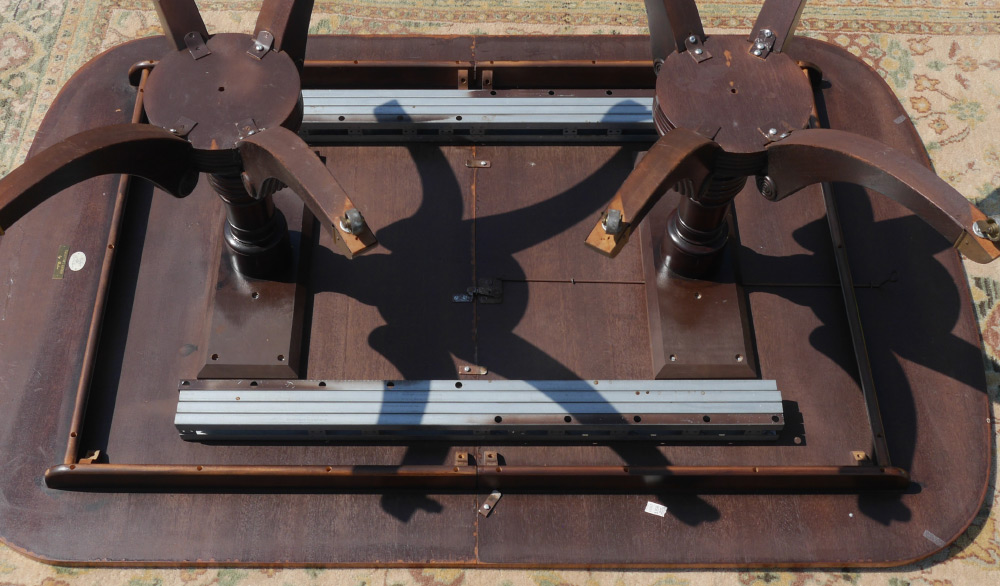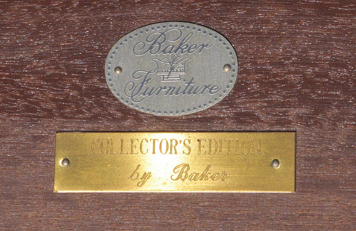BAKER COLLECTIONS EDITION MAHOGANY DINING TABLE: Banded mahogany top, double pedestal base with splayed legs, Baker Collections Edition tag under top. Measures 28'' h. x 72'' x 46'', three 18'' leaves.