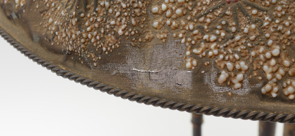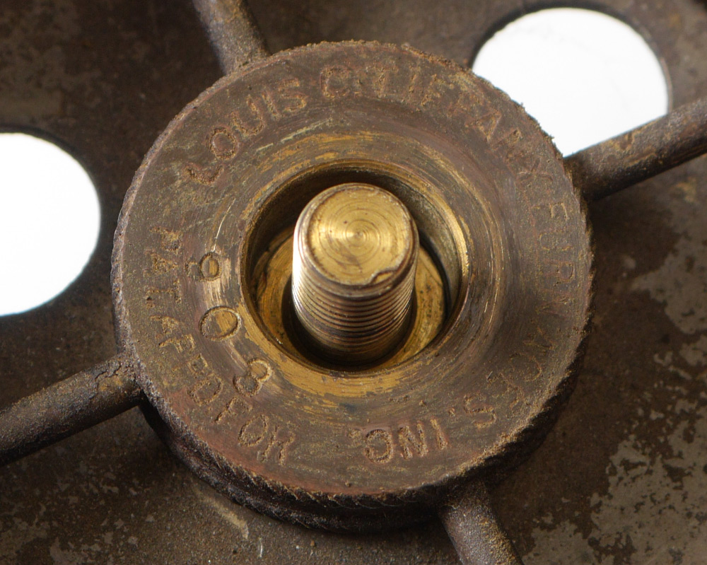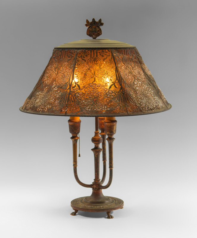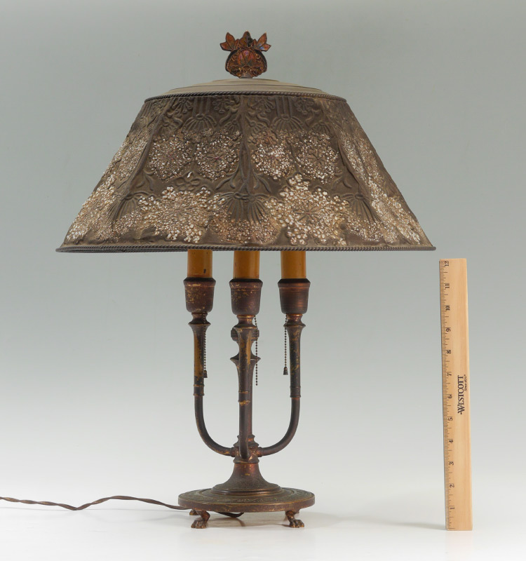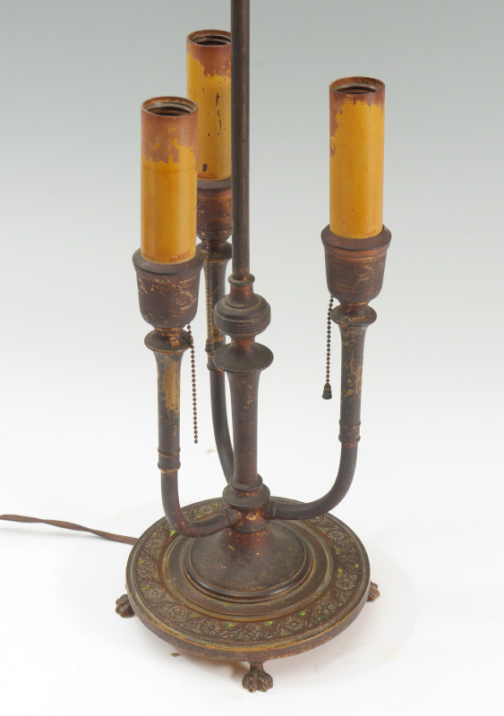 TIFFANY FURNACES BRONZE LAMP WITH MESH SHADE: 3 candlesticks form bronze base on paw feet, enameled gilt finial, marked on base Louis C. Tiffany Furnaces Inc., Favrile, 24. Overall measures 24'' h. x 7''. Sold with a Tiffany Furnaces glass bead enhanced metal mesh shade, 8'' h. x 17 3/4''. From a direct descendant of Rene Lothier, metalsmith for Tiffany Furnaces.