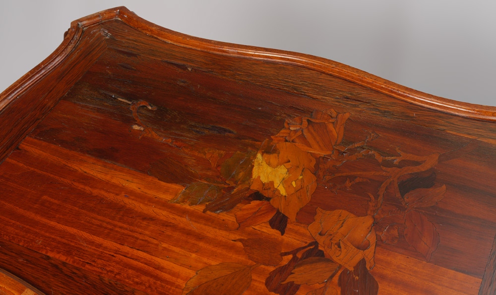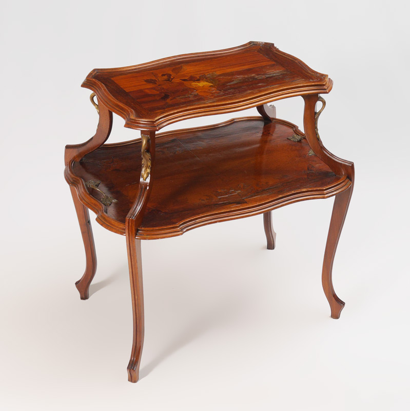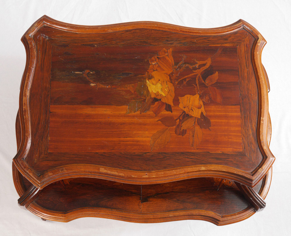 EMILE GALLE MARQUETRY INLAID 2 TIER TABLE: Unsigned attribution to Emile Galle, top level with floral marquetry motif, shaped supports with applied metal leaf form handles, lower level with butterfly and floral motifs, shaped legs. Overall 31 1/2'' h. x 30 3/4'' x 23 1/2''.