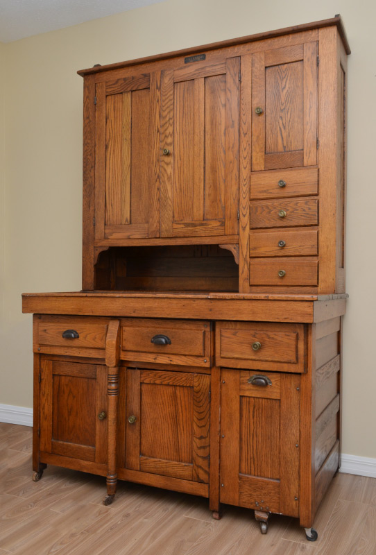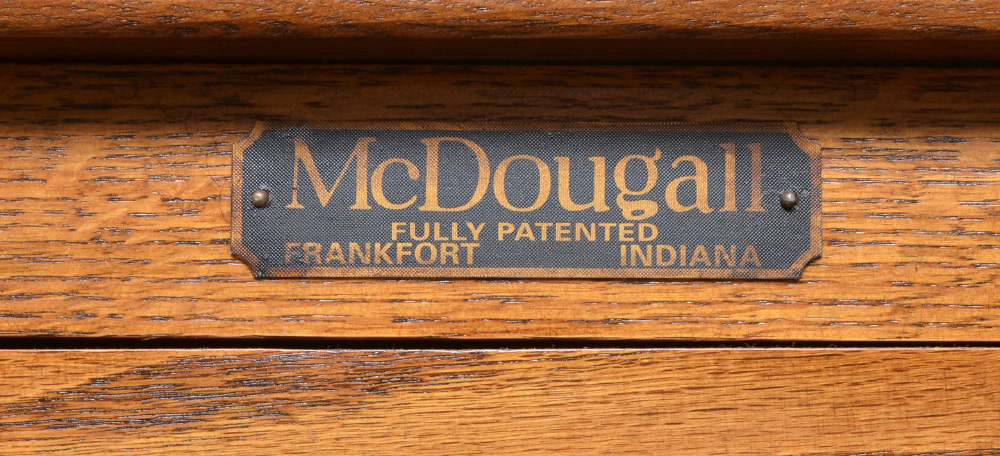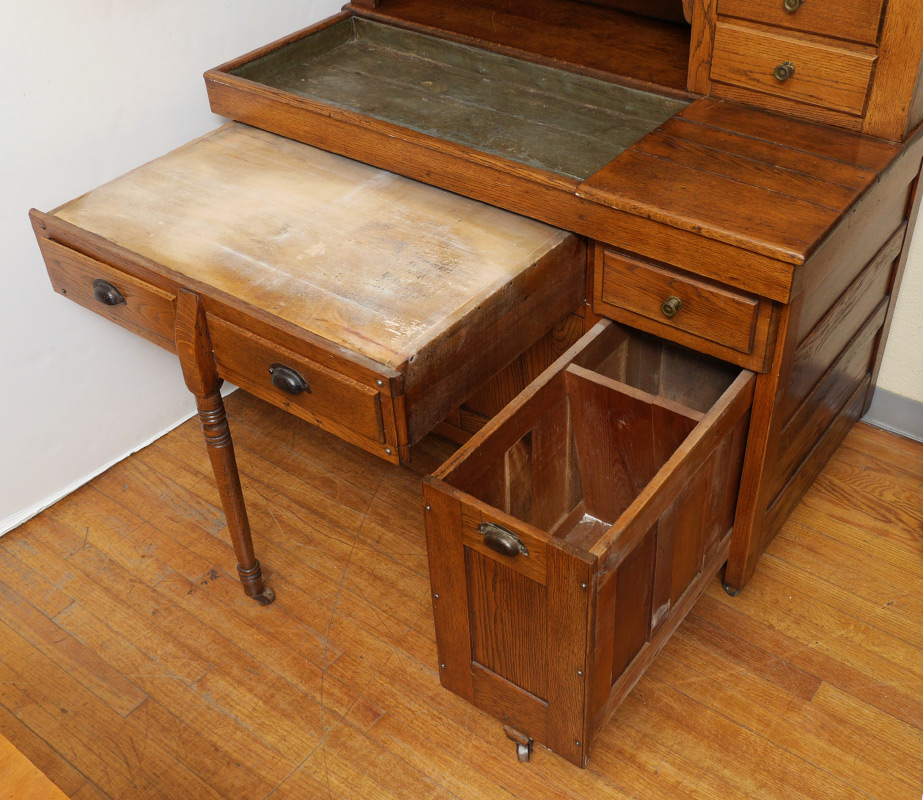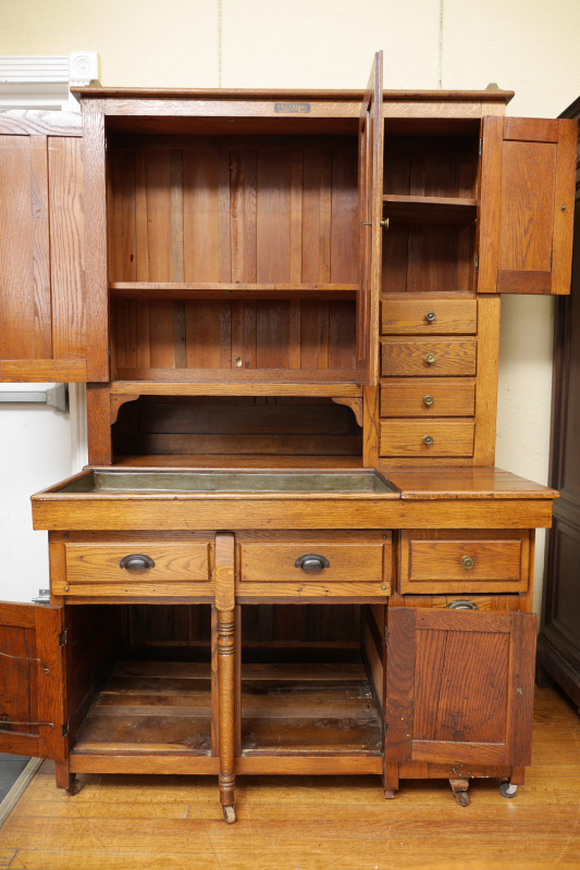 McDOUGALL GOLDEN OAK KITCHEN CABINET: Top section with open gallery top, 2 doors taking up left 2/3, right side with single door over 4 doors. Base with insert metal dry sink section on top, 3 drawers over 2 door and deep drawer, all on castors. Overall measures 79 1/2'' h. x 49 3/4'' x 29''.