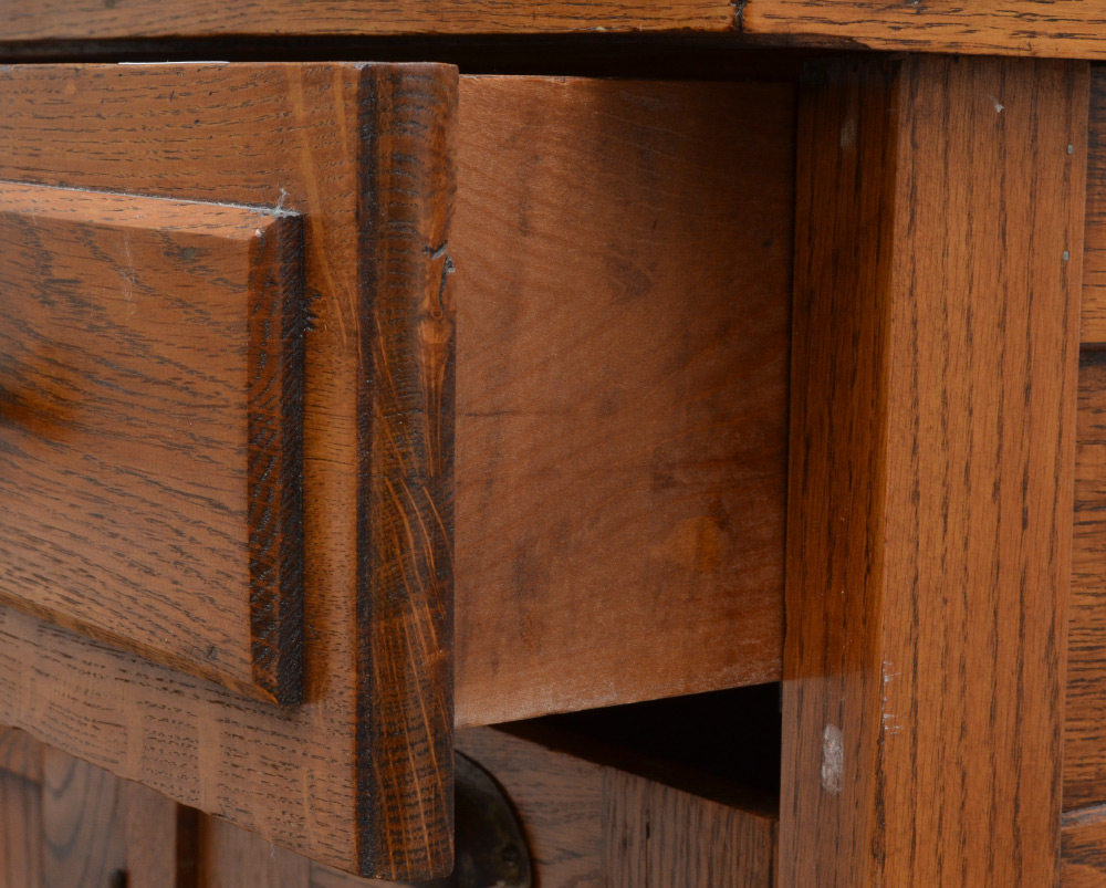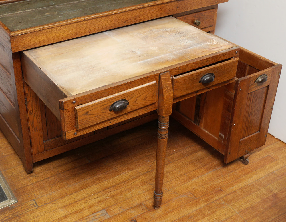 CONDITION: Front right castor replaced, large drawer on bottom right has had a castor added at some point, other wear consistent with age and use.