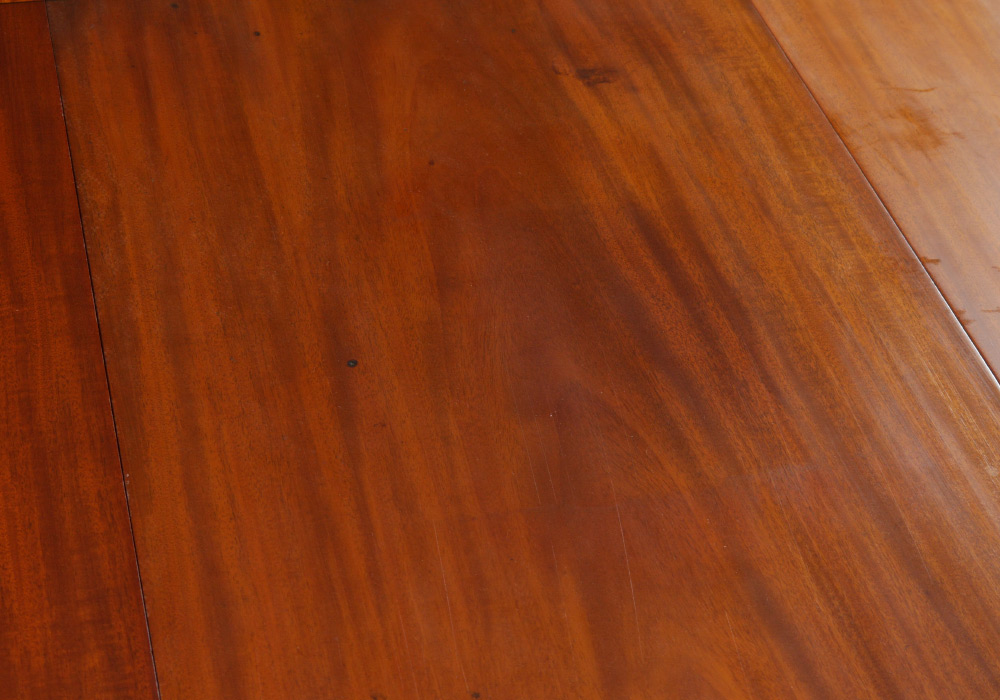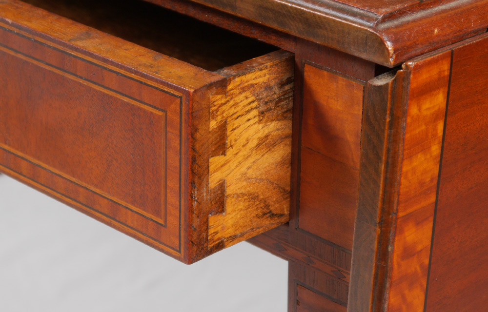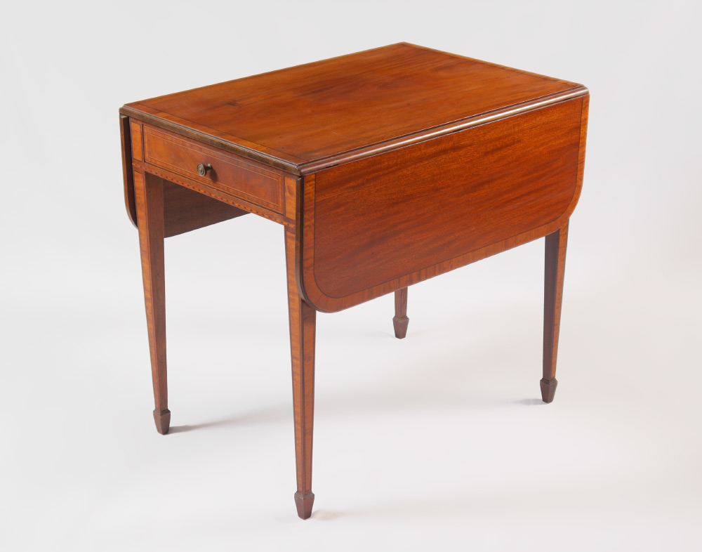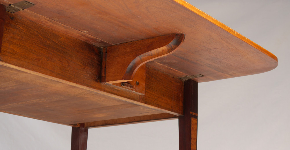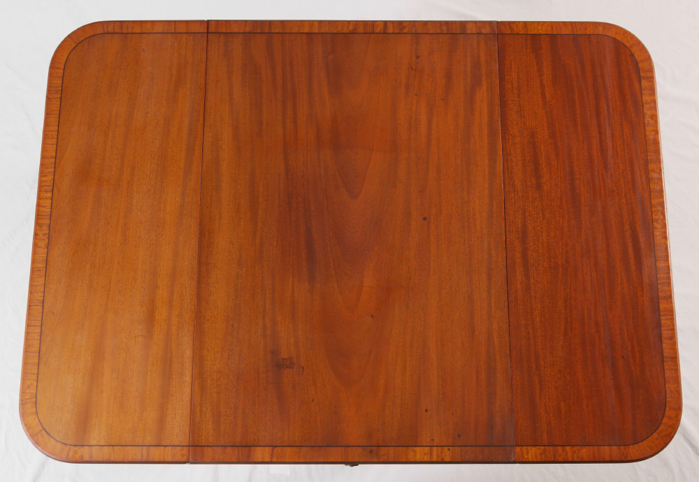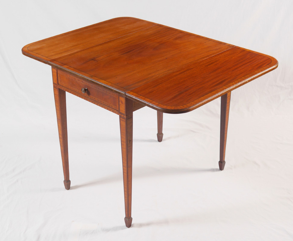 BANDED MAHOGANY DROP LEAF WORK TABLE: Banded mahogany top, 11'' drop leaves either side, single drawer, tapered legs. Overall measures 28 1/4'' h. x 30'' x 21 1/4'' with leaves down.