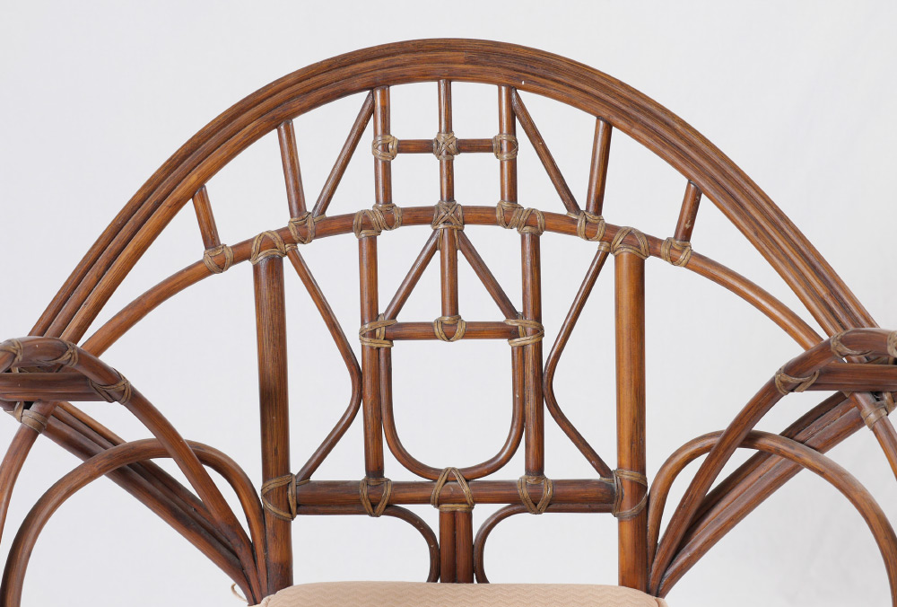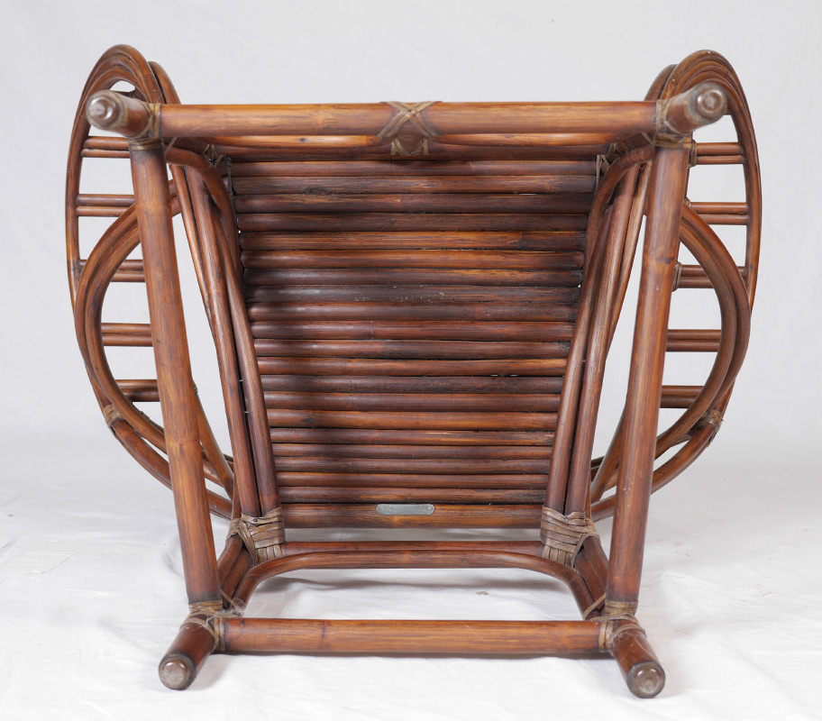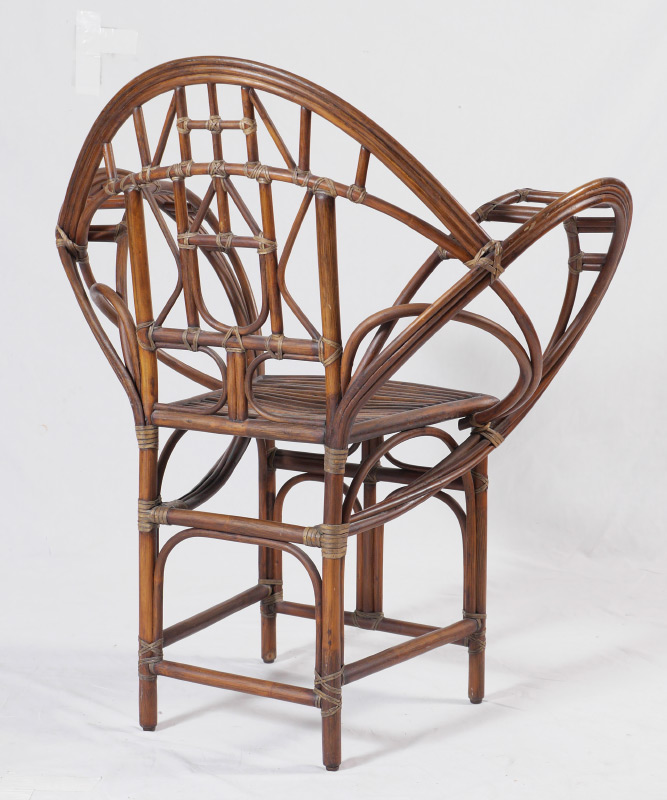 MCGUIRE RATTAN BUTTERFLY CHAIR: Large sweeping arms and shaped back, McGuire metal tag under seat. Pink cushion, overall measures 36 1/4'' h. x 32 1/2''