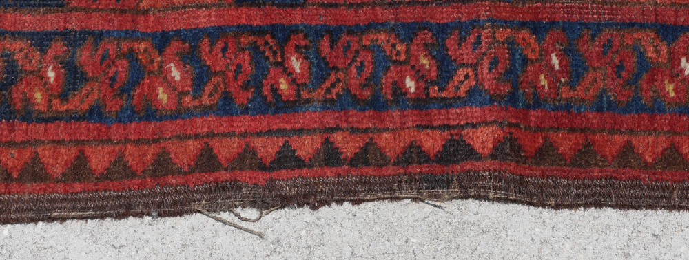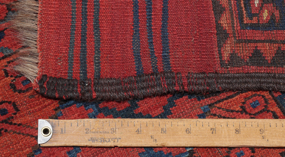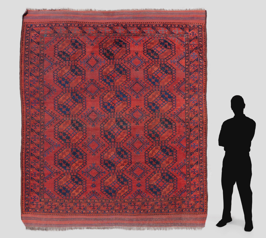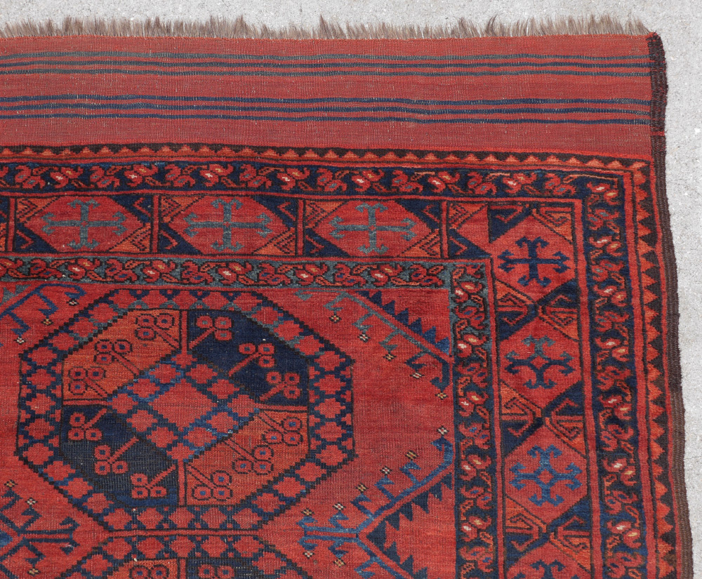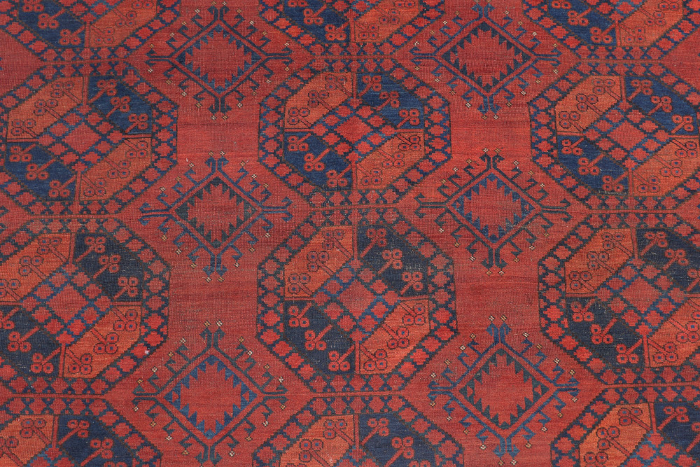 SEMI-ANTIQUE AFGHAN BOKHARA HAND KNOTTED WOOL RUG, 8'8'' x 9'8'': This rug has traditional colors and design with large eight sided ''guls'' that meet end to end and form three rows down the field alternating with smaller snowflake like diamond shaped ''guls'' that fit in between the rows. The colors in the rug include red, shades of blue, and orange. Afghan Bokhara rugs of this age are different from the Pakistani Bokhara in that they retain a real tribal feel as if they were not woven for the market.