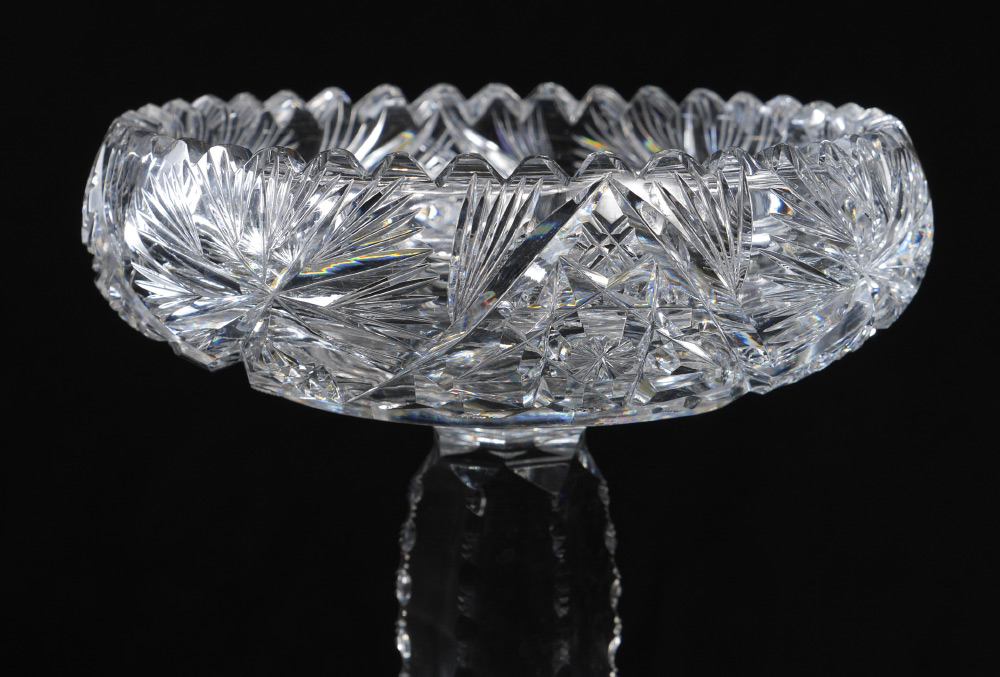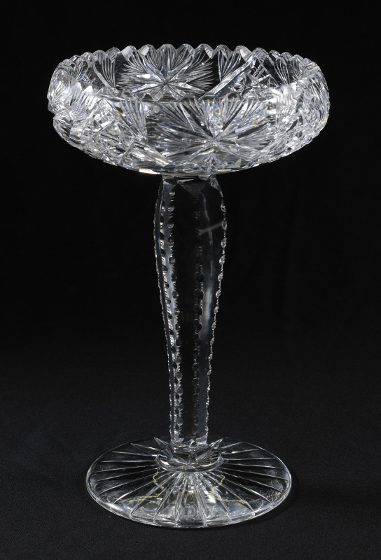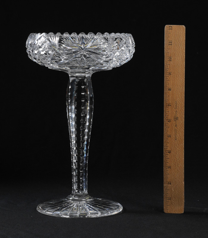 AMERICAN BRILLIANT PERIOD CUT GLASS COMPOTE: On a tall notched stem. Measures approx. 11.5'' tall x 7'' dia.
