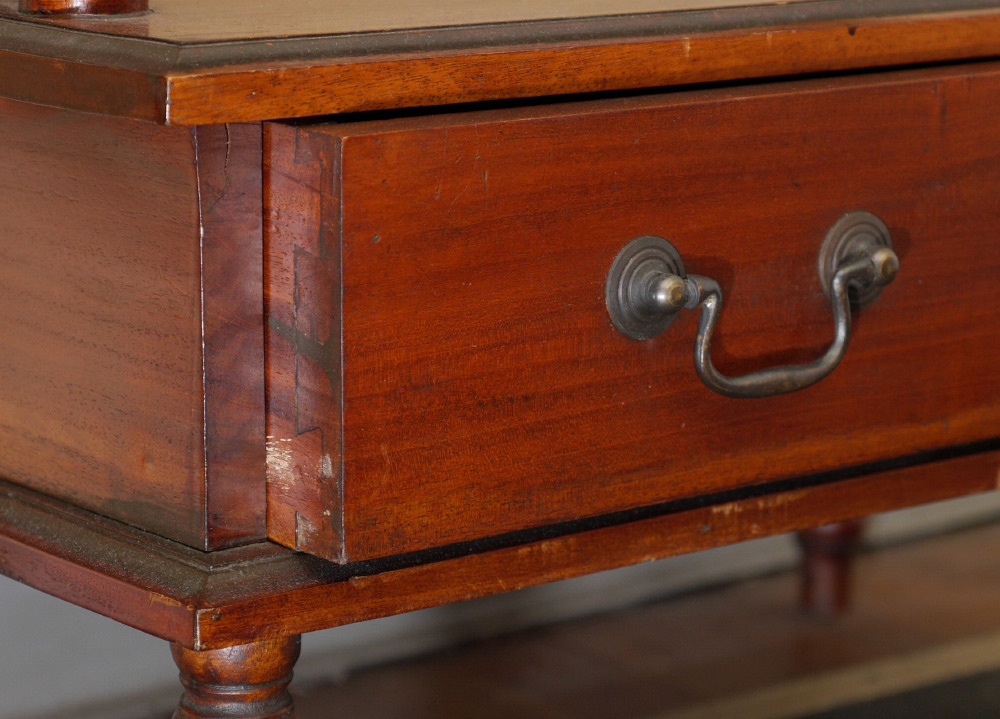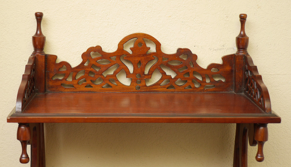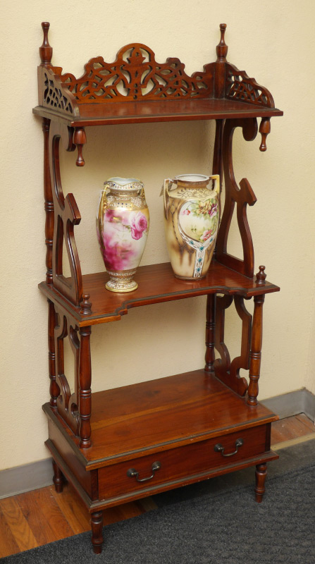 VICTORIAN CARVED ETAGERE: 2 open shelves over single drawer, open work carved gallery and supports, on 4 turned legs, 59'' h. x 25 1/2'' x 15 3/4''.