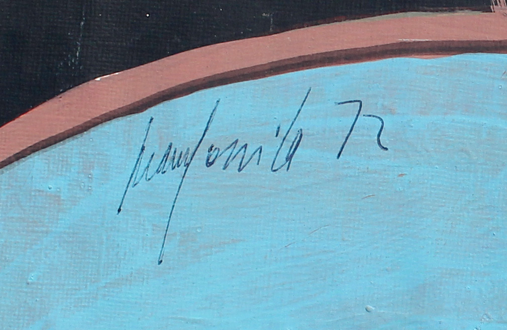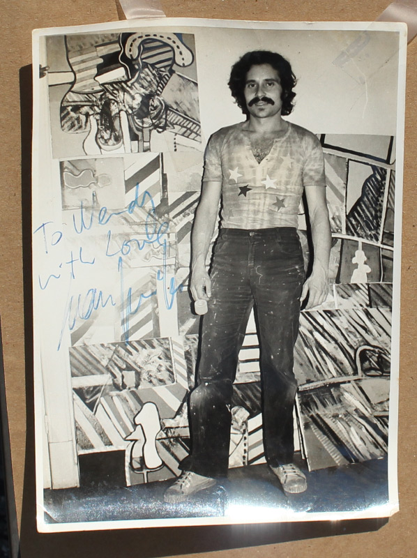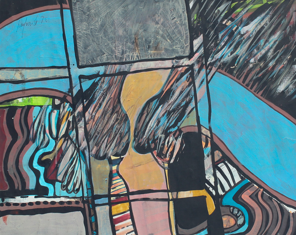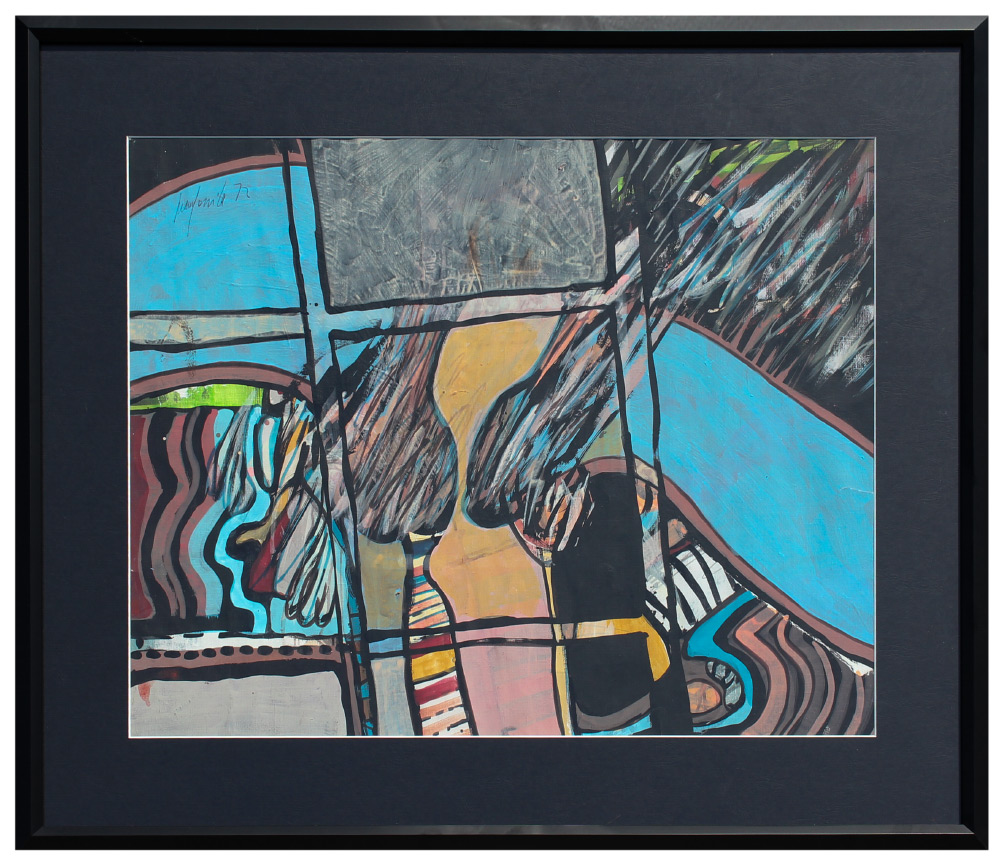 GOMILA, Juan (Spanish, 1942 -): Abstract Composition, Gouache, sight size 19.5'' x 25.25'', signed upper left and dated '72, custom black frame, 27.5'' x 33.25''. Original photograph of artist with dedication verso '' To Wendy with Love, Juan Gomila''.