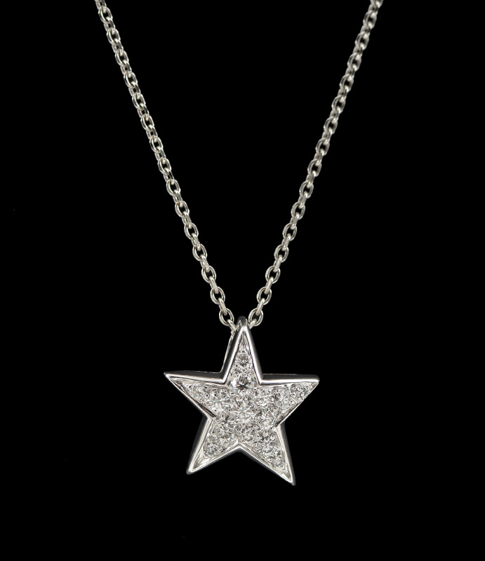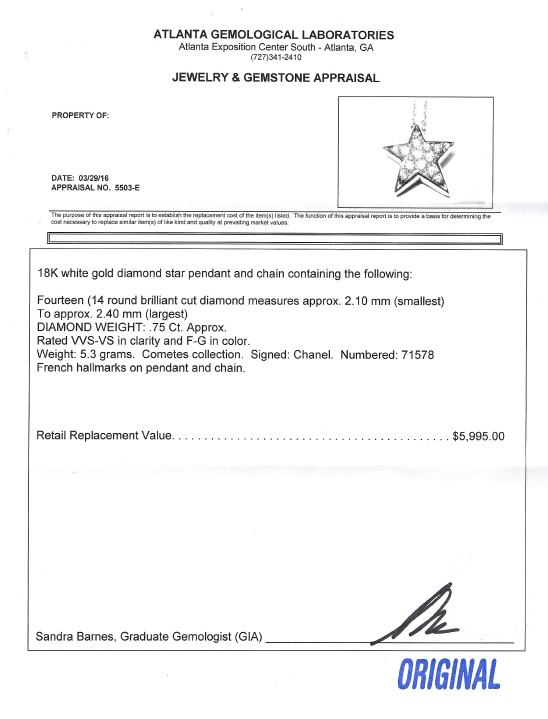 CHANEL COMETE DIAMOND STAR NECKLACE: 18K white gold star pendant and chain. The diamonds total approx. .75 Ct., are rated VVS-VS in clarity and F-G color. Mademoiselle Chanel used to say: ''I wanted to cover women in constellations. Stars! Stars of all sizes''. Well here is your star. Well signed and numbered 71578. The pendant and chain have French hallmarks. Chain approx. 16''. Weight 5.3 grams. Sold with current Atlanta Gemological GIA graduate's appraisal for $5,995.