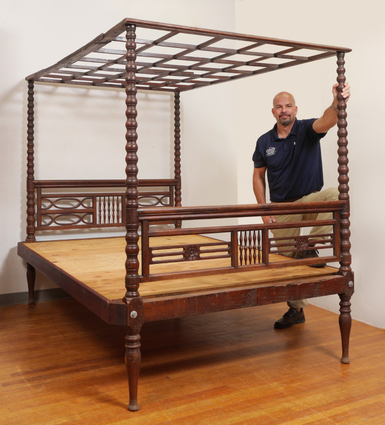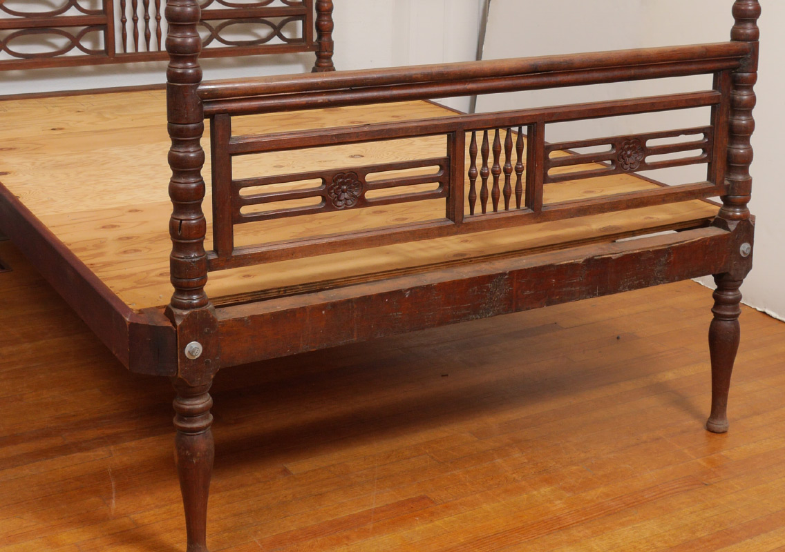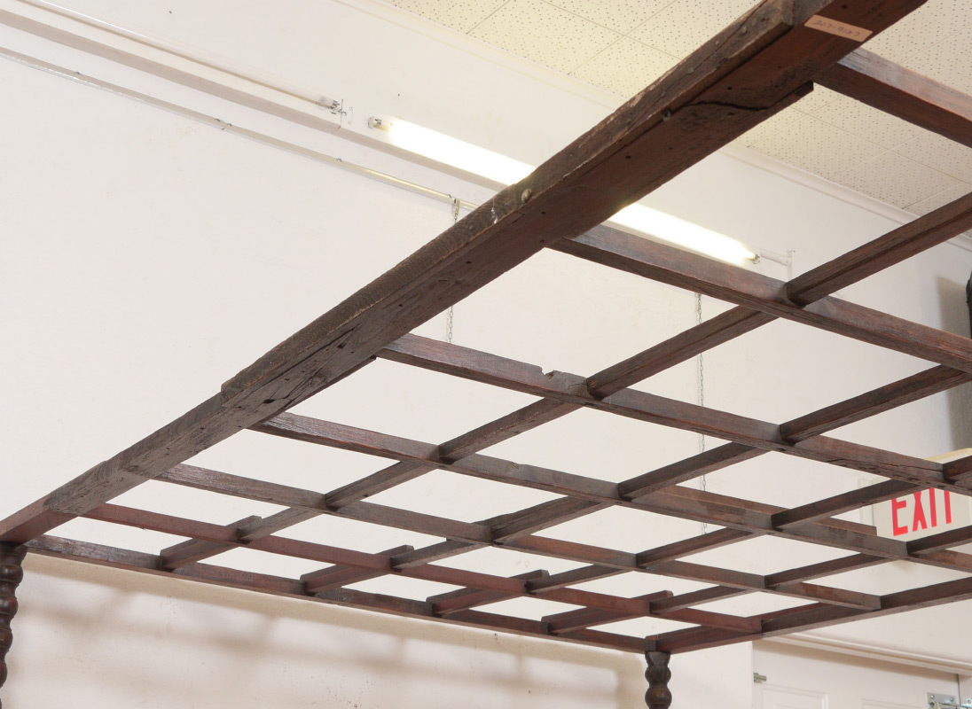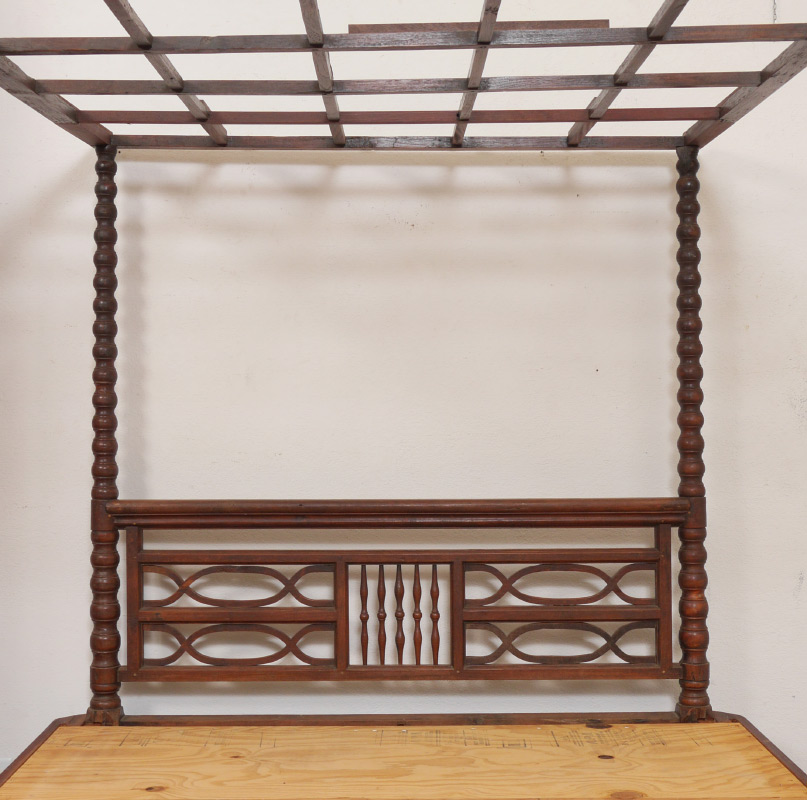 SPOOL TURNED FOUR POSTER CANOPY BED: Platform bed in a striking design of spool turned posts, spindle head and foot board, and wood lattice canopy. The platform measures 64'' x 83'' and will accommodate a queen size mattress. Overall the bed measures approx. 75 1/2'' high x 92'' x 64''.