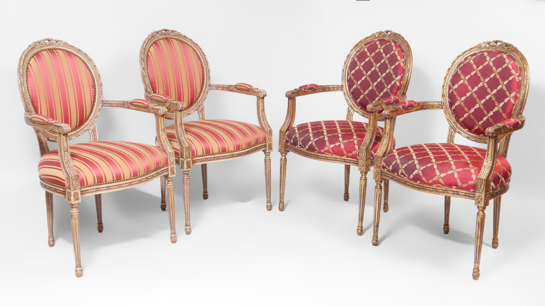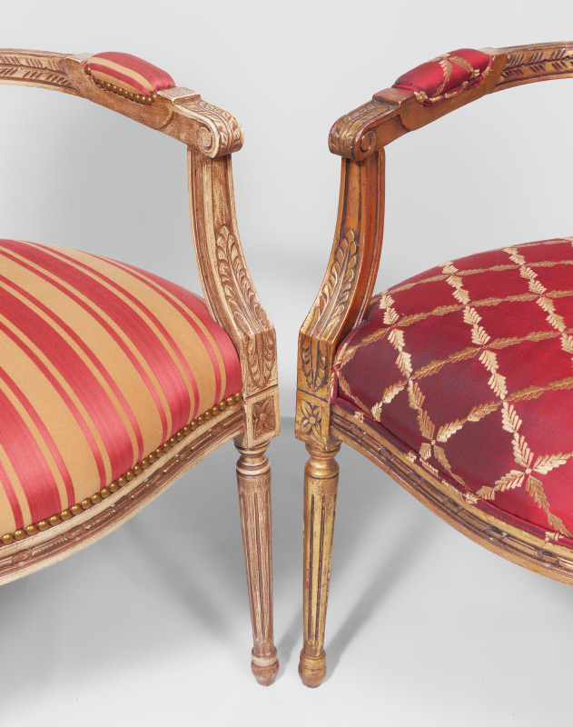 4 FRENCH CARVED GILT WOOD ARM CHAIRS: Carved and shaped frame with foliate motifs. Shaped arms, supports and apron, fluted legs. 2 chairs with gilt decoration and foliate patterned upholstery, 2 missing gilt and have striped upholstery. 40'' h. x 24 1/4'' x 25''.
