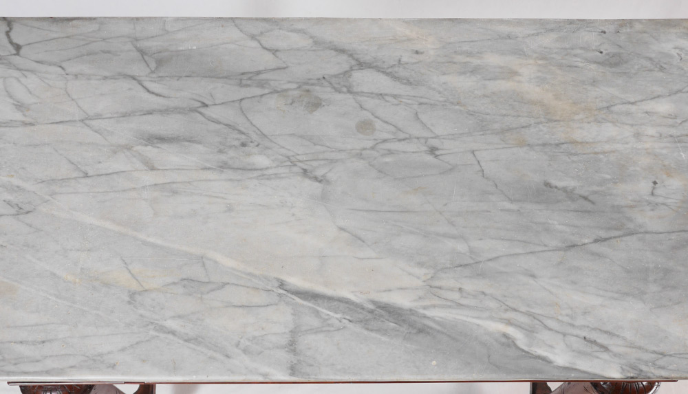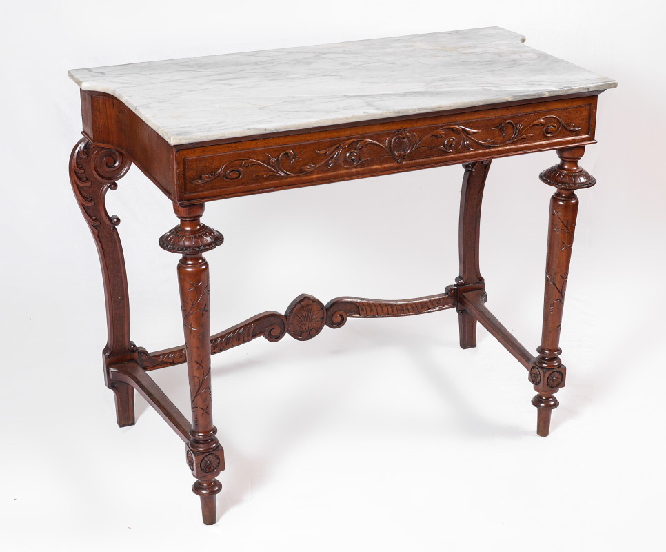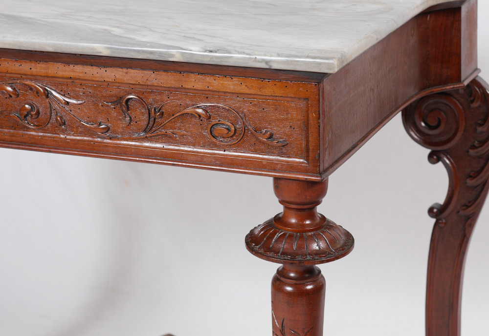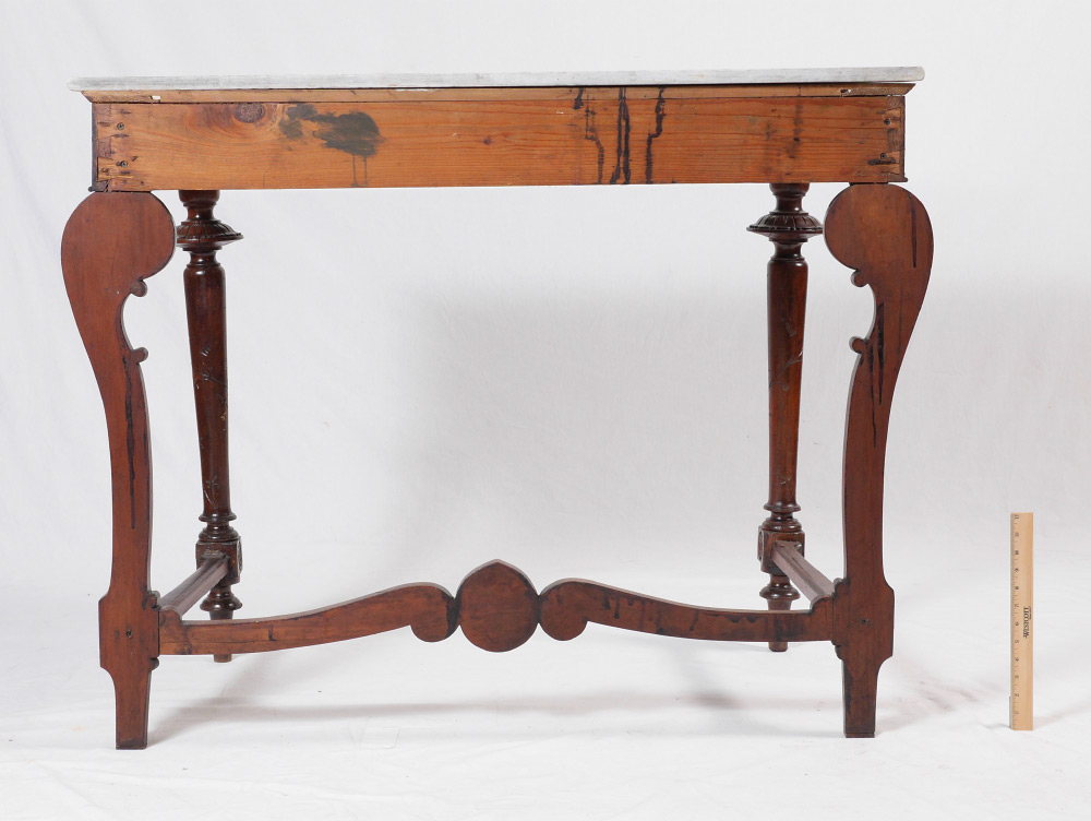 MARBLE TOP CONSOLE TABLE: Shaped grey variegated marble top, front apron with applied foliate scroll decoration, shaped sides, carved and turned front legs, carved and shaped back legs and back stretcher. Overall measures 36 1/2'' h. x 45 1/2'' x 23''.