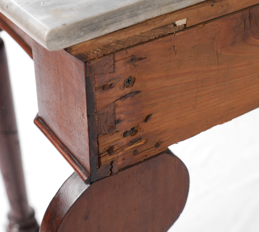 CONDITION: Scratches to marble, repair and chip to front left leg.
