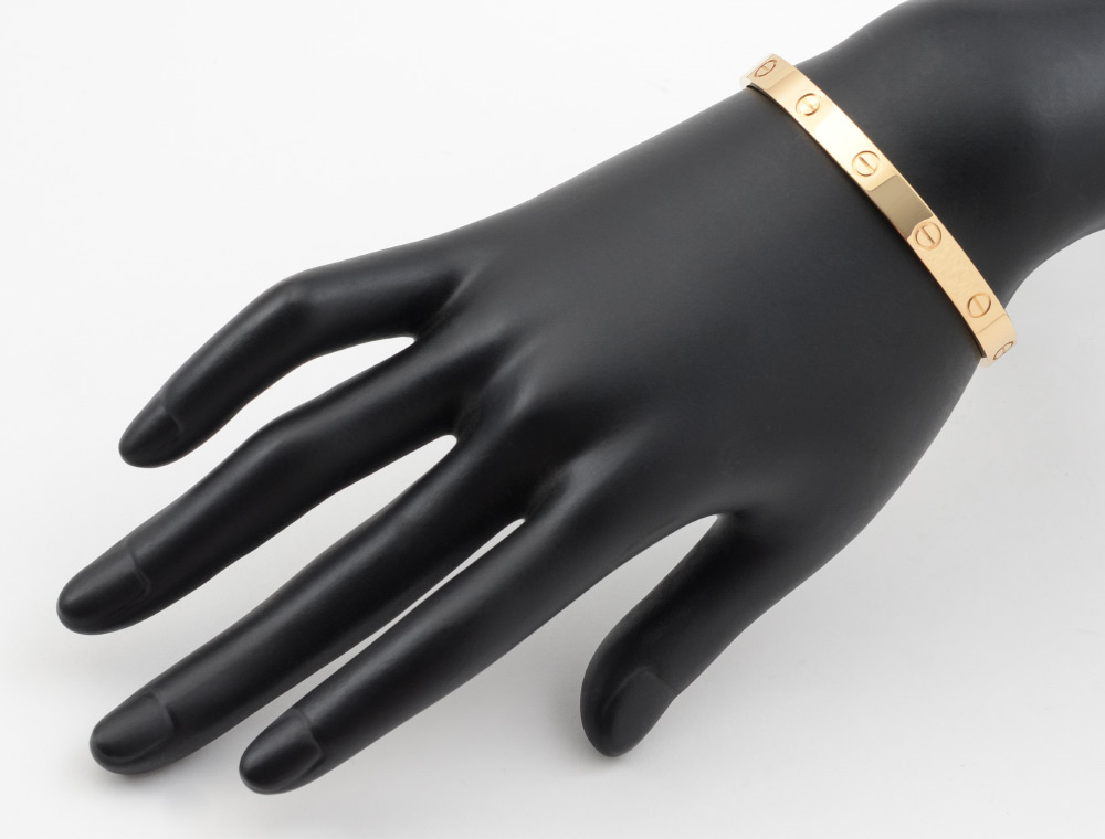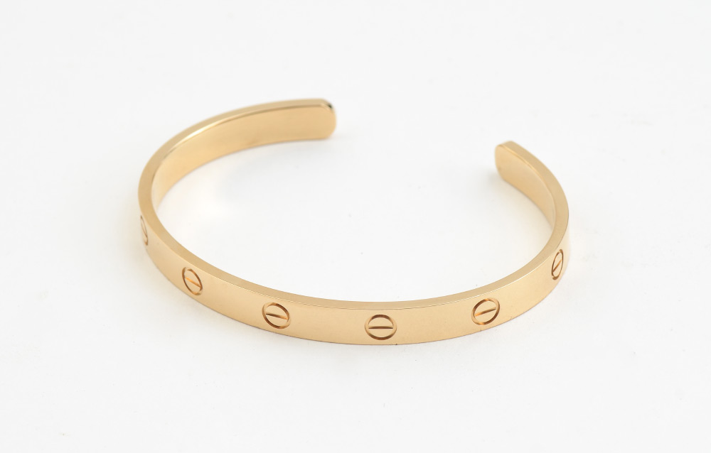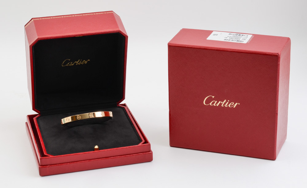 CARTIER OPEN CUFF LOVE BRACELET: Crafted from 18K yellow gold in the iconic screw motif first presented in the 1970's for the Love Collection. Size 18. Like new in the presentation and the over box. Well signed. Weight 27.2 grams.
