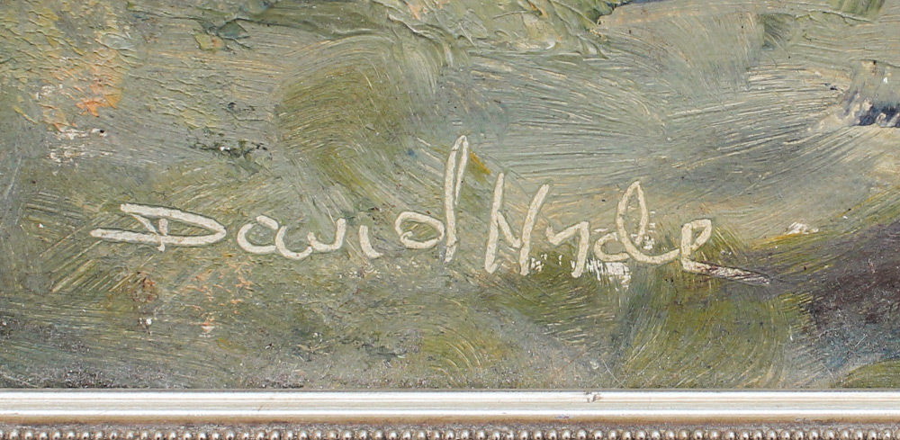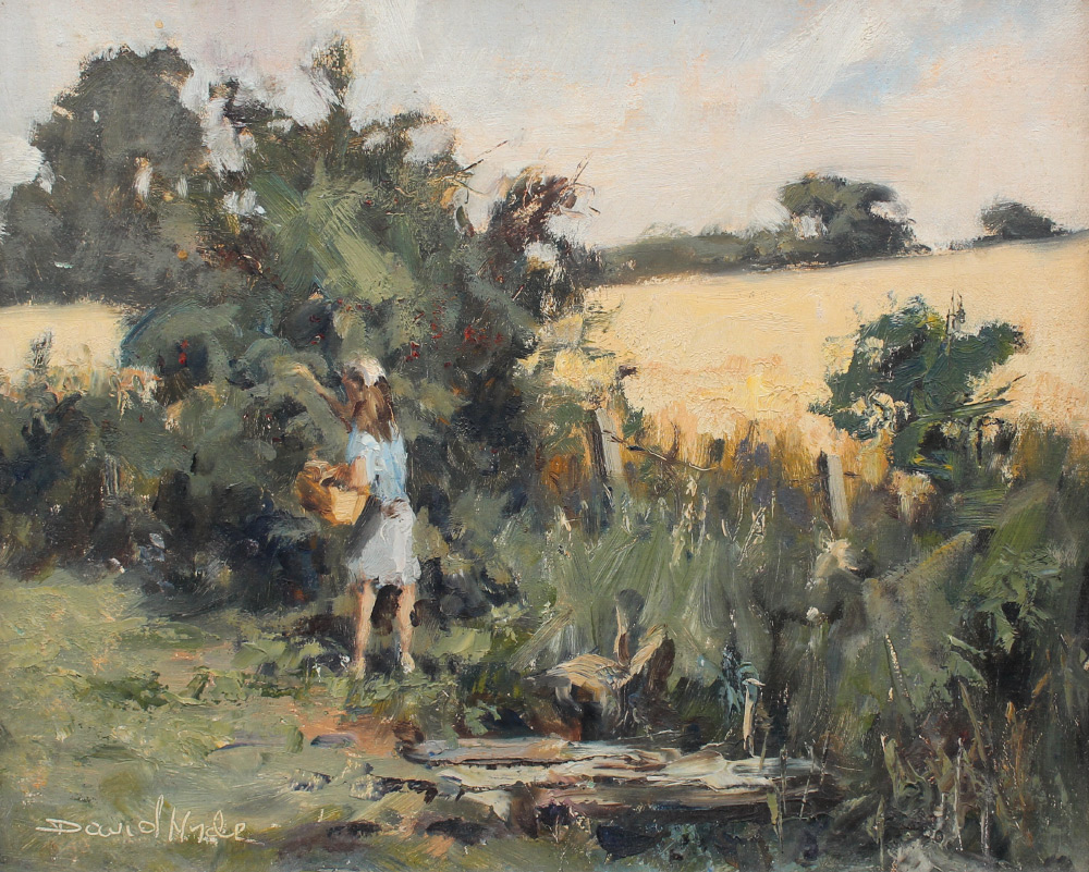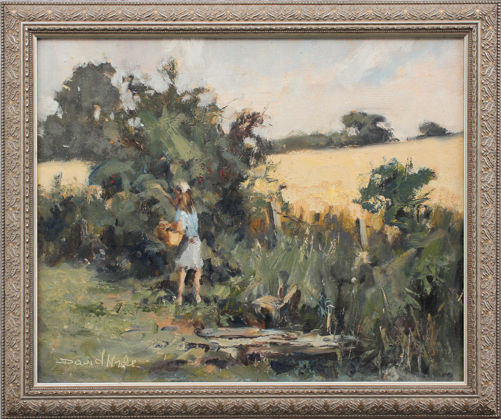 HYDE, David, (American 20th C): Artist's Wife Picking Apples, Oil/Board, 13'' x 16'', signed lower left, custom Michael Murphy frame, 15.25'' x 18.25''.