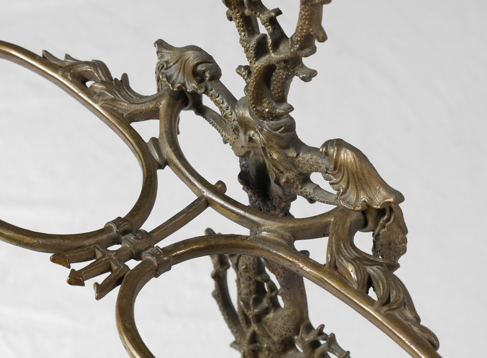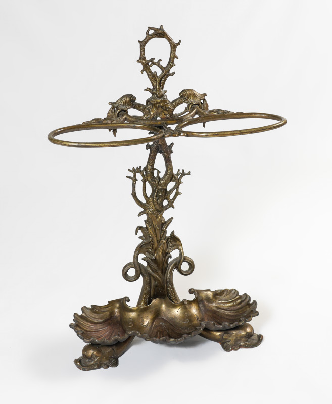 FIGURAL CAST IRON UMBRELLA STAND: Patinated heavy cast iron with stylized coral body, figural dolphin feet, shell motif lower drip tray. Overall measures 31 1/2'' h. x 21 1/2'' x 9''.