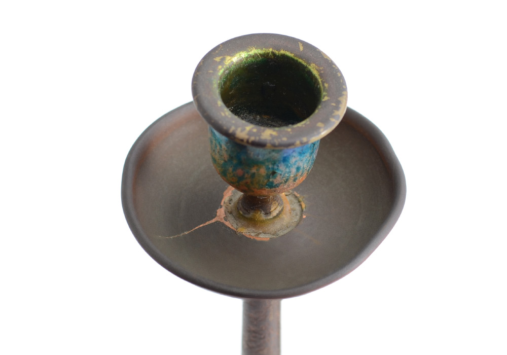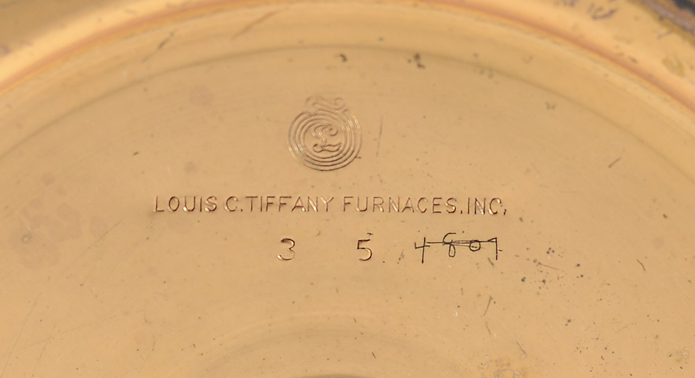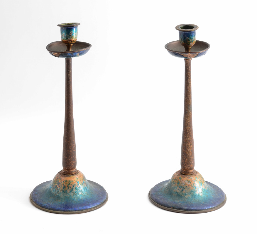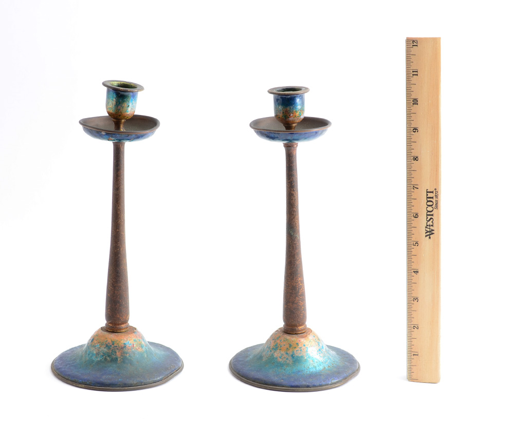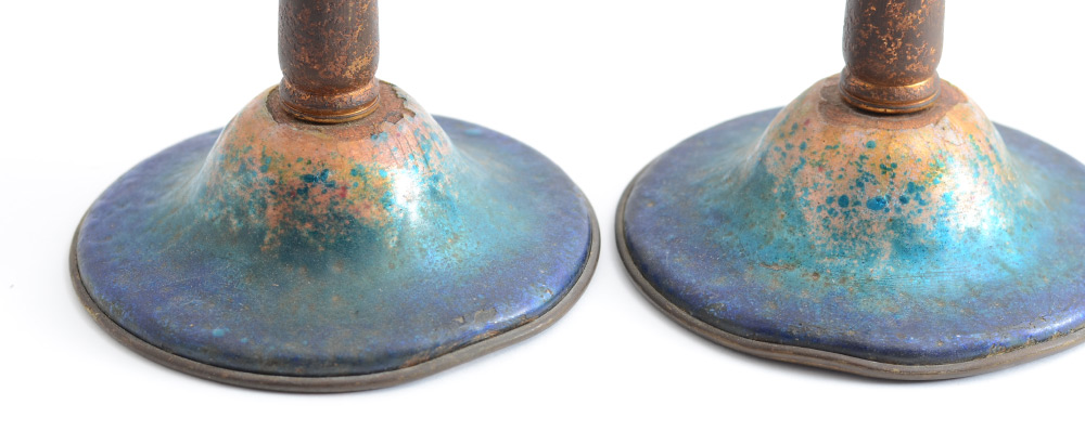 PAIR TIFFANY FURNACES ENAMELED CANDLESTICKS: Bronze with enameled base and top, signed on base Louis C. Tiffany Furnaces, Inc., 35. Overall 10 1/4'' x 4 1/2''. From a direct descendant of Rene Lothier, metalsmith for Tiffany Furnaces.
