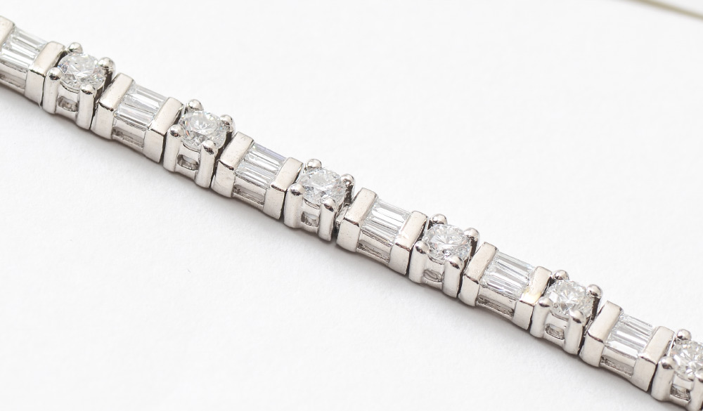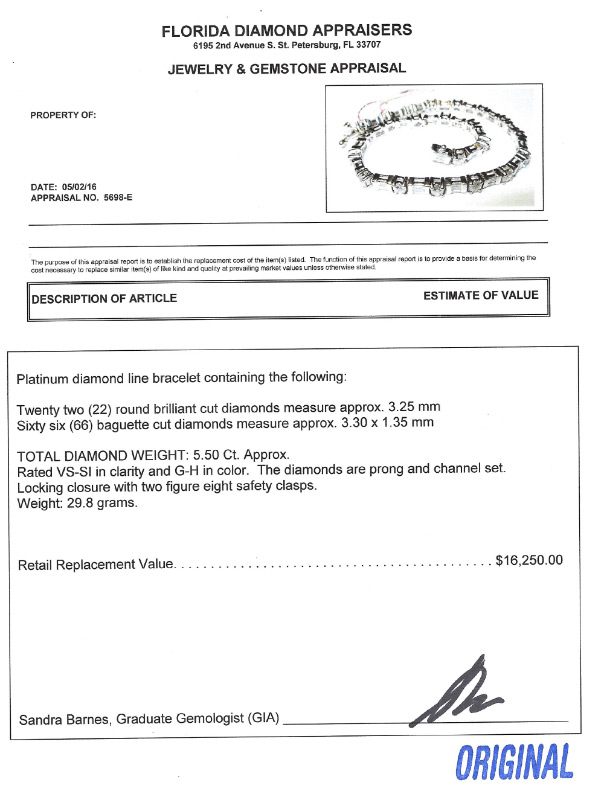 PLATINUM AND 5.5 CT DIAMOND TENNIS BRACELET: 22 round brilliant and 66 baguette diamonds in platinum. The diamonds are rated VS-SI in clarity and G-H color. Length 8.25''. Weight 29.8 grams. Sold with current Florida Diamond Appraisers GIA graduates appraisal for $16,250.