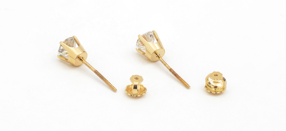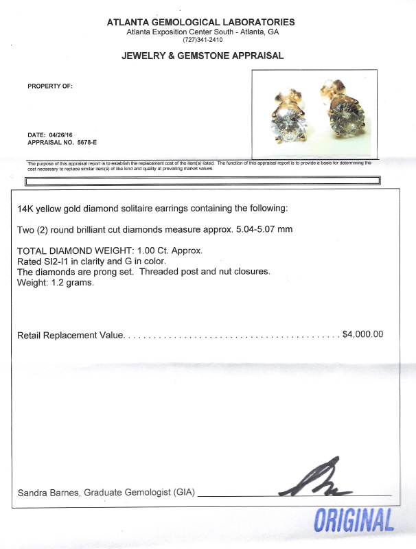 DIAMOND STUD EARRINGS: Two round brilliant cut diamonds in 14K yellow gold, totaling approx. 1.00 Ct., rated SI2-SI1 in clarity and G color. Threaded post and nut closure. Weight 1.2 grams. Sold with Actual age unknown. current Atlanta Gemological GIA graduate's appraisal for $$4,000.