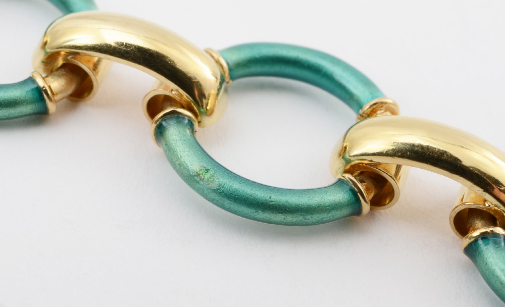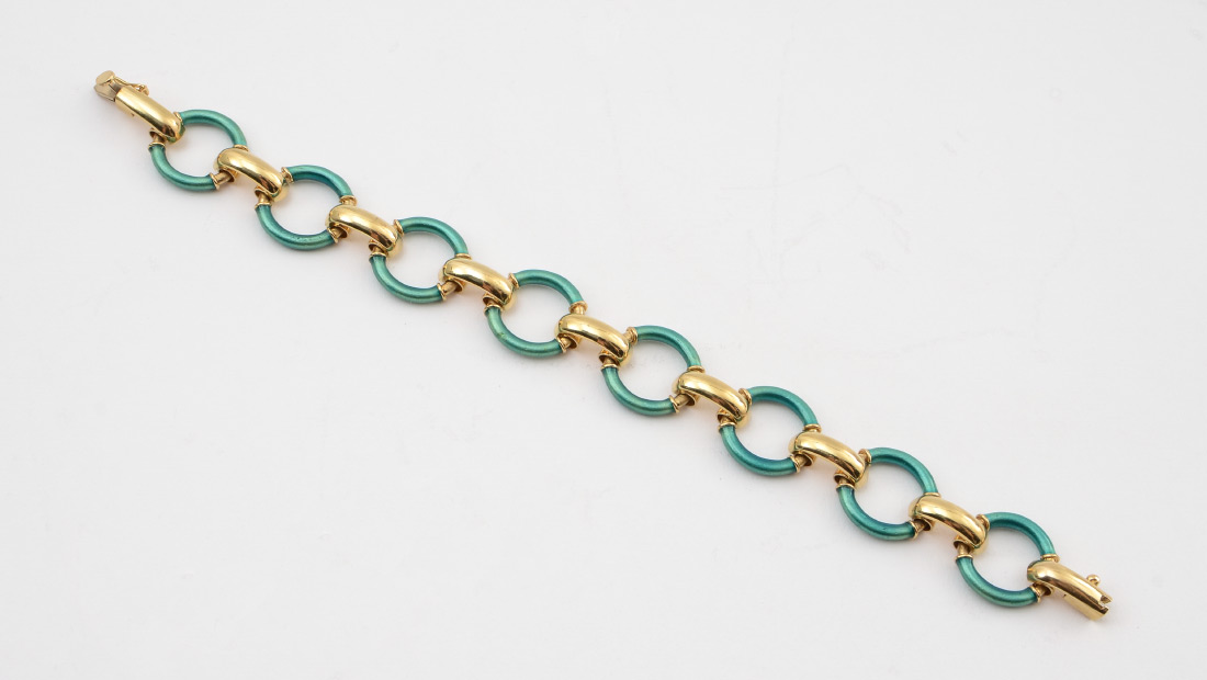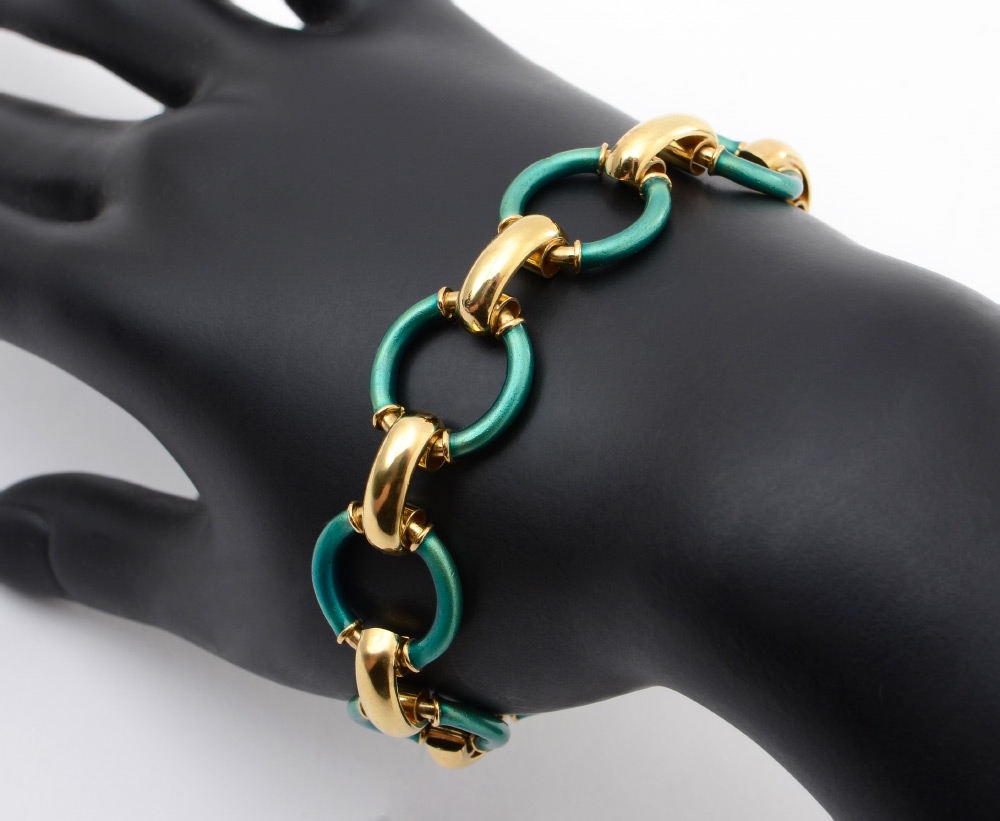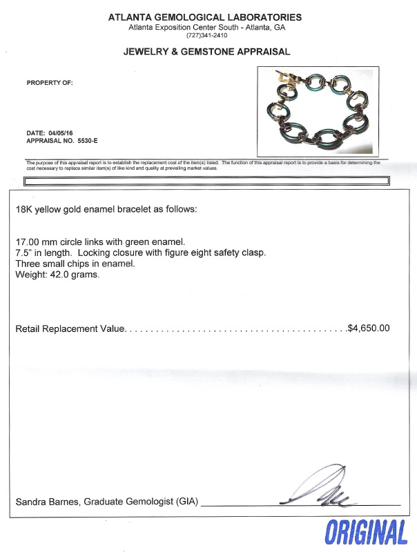 ITALIAN ENAMELED 18k GOLD BRACELET: Mid Century yellow gold bracelet, green enameled circle links measure 17mm. Bracelet measures 7.5 ''. There are 3 minute chips to the enamel. Weight 42 grams. Sold with current Atlanta Gemological GIA graduate's appraisal for $4650.