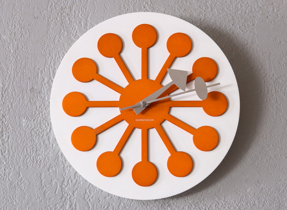 SIGNED GEORGE NELSON WALL CLOCK: White painted wood back with orange ''lollipop'' design, marked George Nelson on dial, battery quartz movement. 12'' dia.