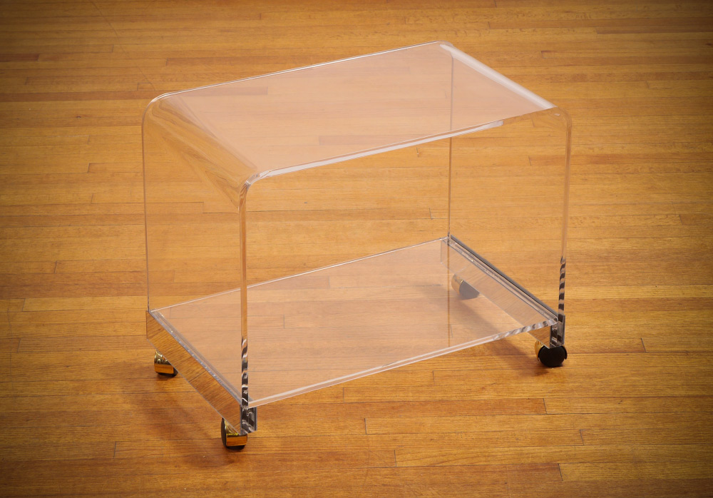 LUCITE 2 TIER ROLLING STAND: Rectangular top with bent corners, open lower shelf, on castors. 22'' h. x 27'' x 16''.
