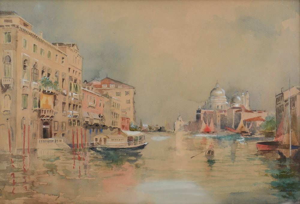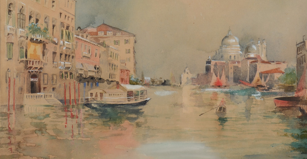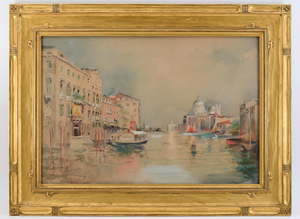TURN OF THE CENTURY VENETIAN CANAL PAINTING: Watercolor, 13.75'' x 20.75''. Superior carved wood and gilded frame, 20'' x 27'', possible signature lower right.