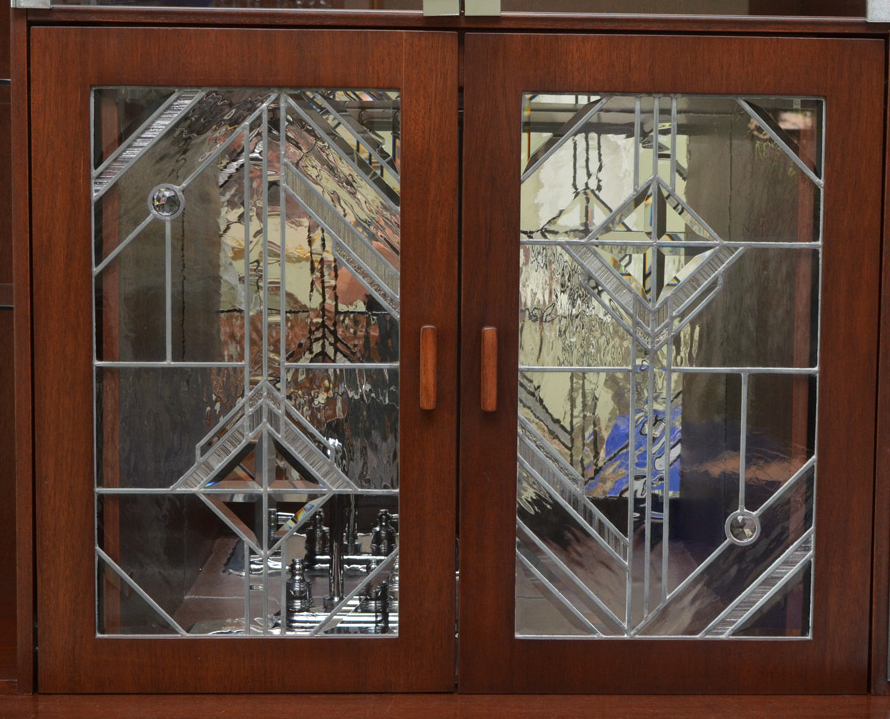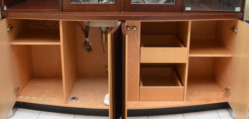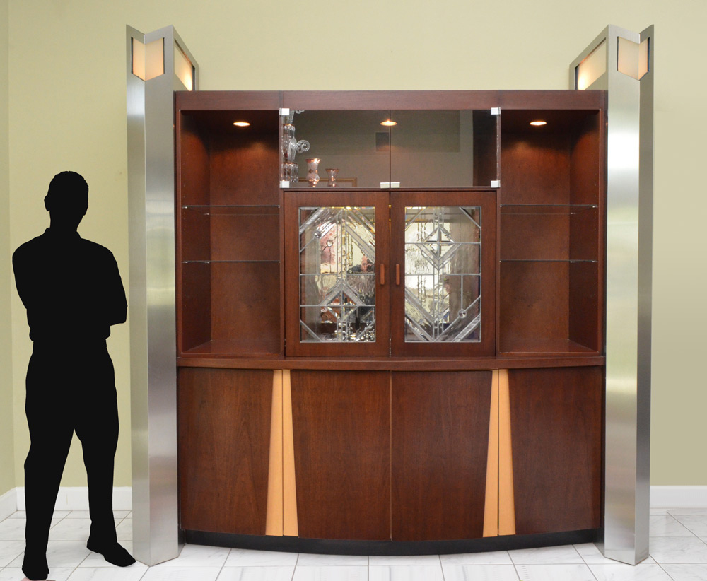 CONTEMPORARY CUSTOM WET BACK BAR: Custom made by Johns Pickers in Largo, Florida, twin stainless steel columns with frosted glass windows at tops. Center with open storage over 2 leaded glass doors which slide and retract, opens to sink. Glass shelves either side. 4 door base, right side with 2 drawers and shelf, left side open for plumbing and shelf. Overall measures approx. 95'' h. x 92'' x 31 1/4''.
