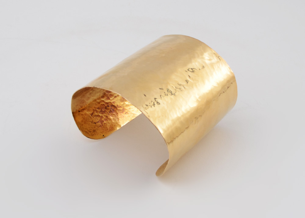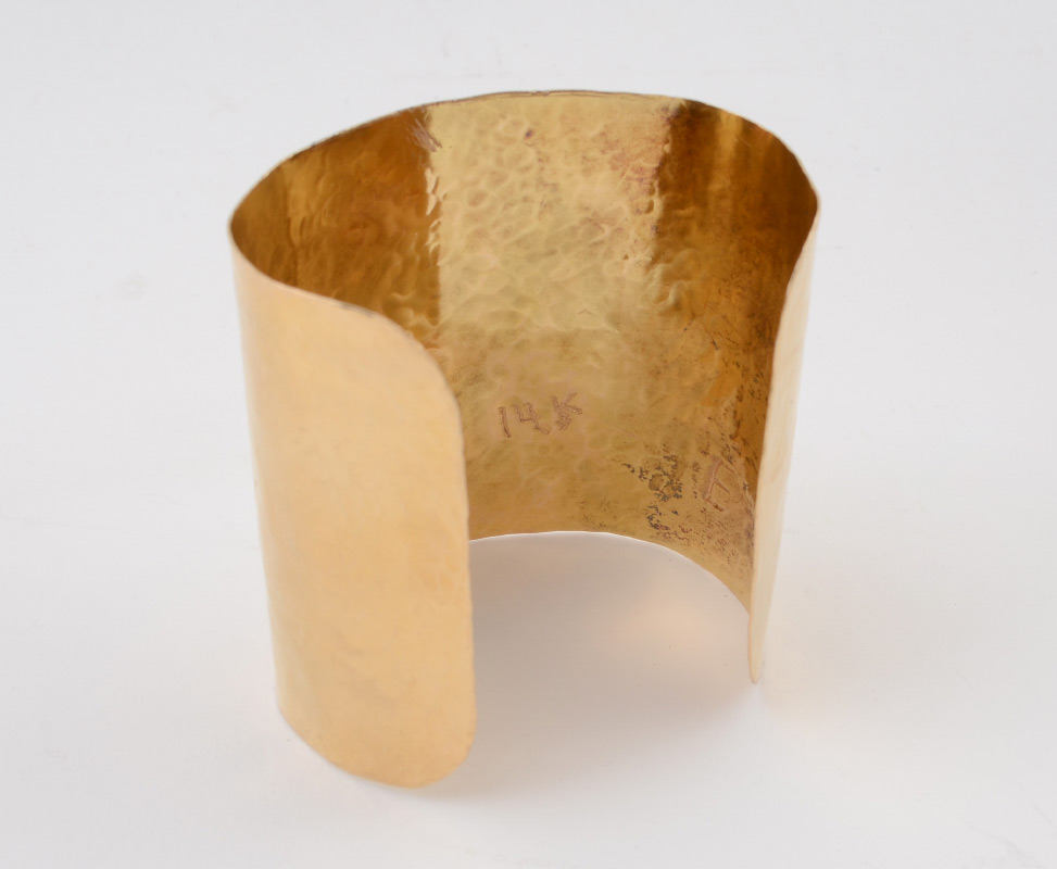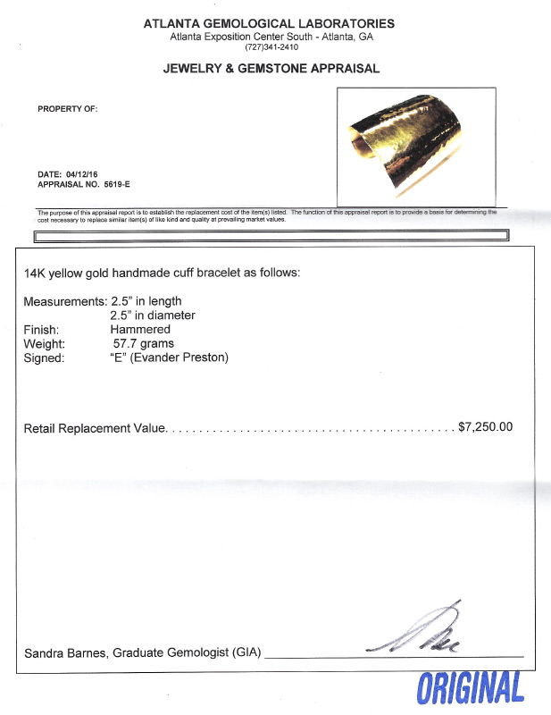 EVANDER PRESTON 14K GOLD WIDE CUFF BRACELET: Handmade in a hammered finish. Signed. Measures 2.5'' wide, 2.5'' diam. Weight 57.7 grams. Sold with current Atlanta Gemological GIA graduate's appraisal for $7250.