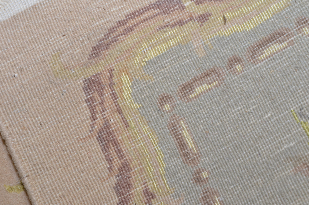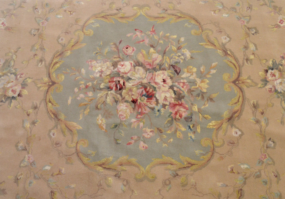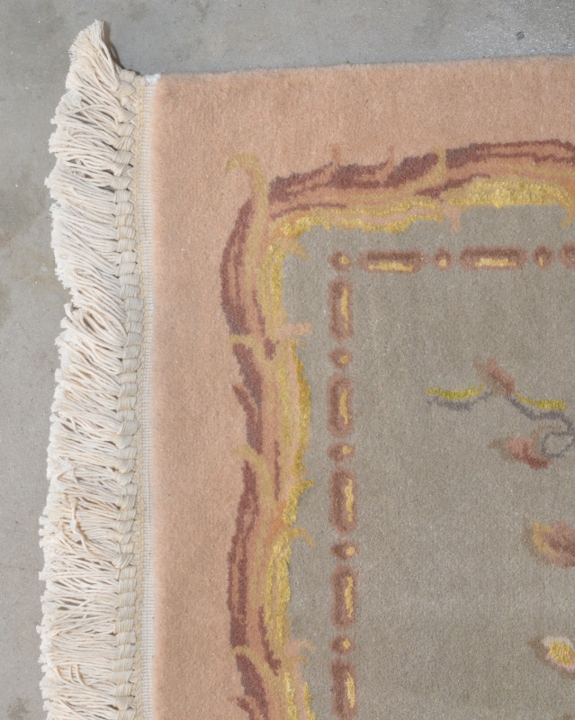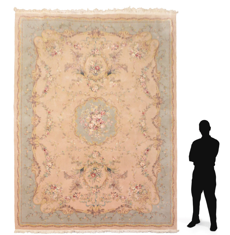APPROX 20-40 YR OLD SINO-PERSIAN WITH AUBUSSON DESIGN HAND KNOTTED WOOL RUG, 8'6'' x 11'9'': Large roses in pinks, reds, and white form the inner design of the grey/blue central medallion. The medallion and other featured motifs in the rug are outlined with a pretty yellow color. Garlands of flowers loop out from the sides and ends of the field to decorate more of the ivory central ground. The soft blue/grey main border is also bordered by yellow and beige outlines and a delicate garland of flowers goes all the way around the rug. Condition is good.