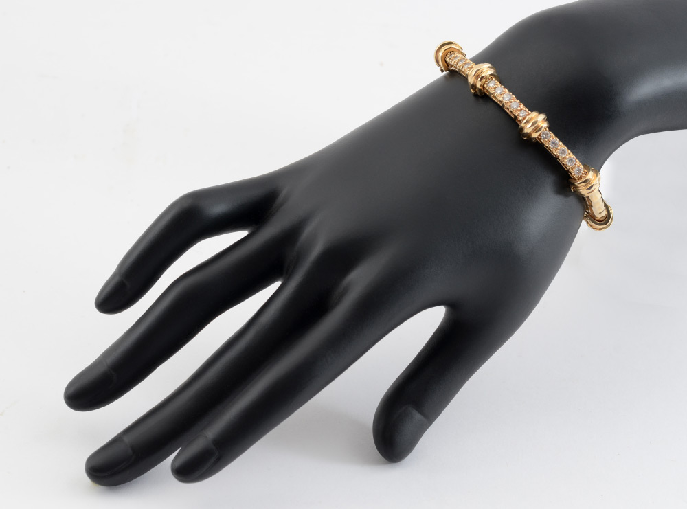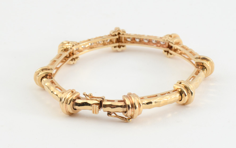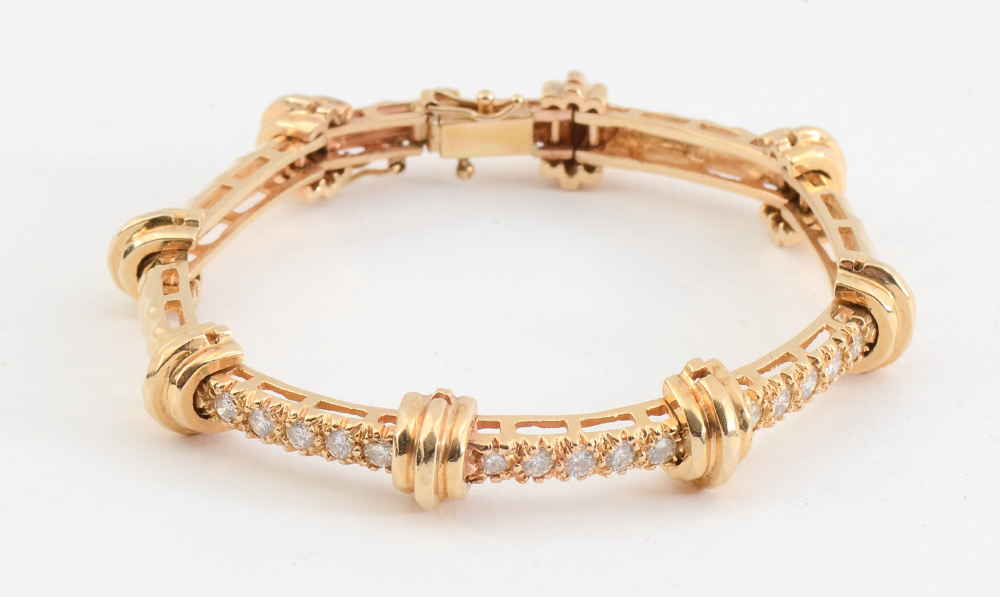 18K DIAMOND BRACELET: 18K yellow gold link bracelet with 15 round full cut diamonds totaling approx. 1.05 Ct., averaging I-J color and SI2-SI1 clarity. Length 7''. Weight 25 grams. Sold with current Schuler Gemological GIA graduates written appraisal for $3,050.