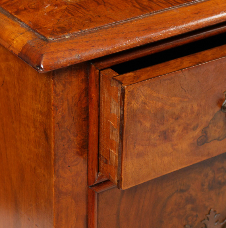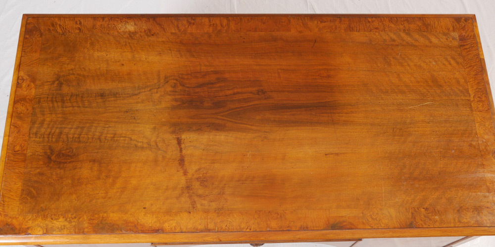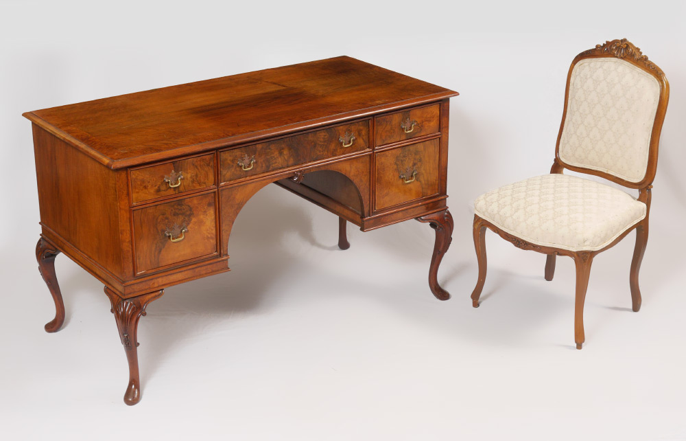BURL WALNUT CHIPPENDALE STYLE DESK AND CHAIR: Burl veneer desk with single center drawer, 2 drawers either side, carved and shaped legs ending in pad feet, 31 1/2'' h. x 52'' x 26''. Chair with carved top rail, floral pattern upholstered back and seat, 38 1/4'' h. x 19 1/2'' x 20 1/2''