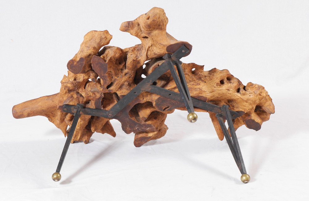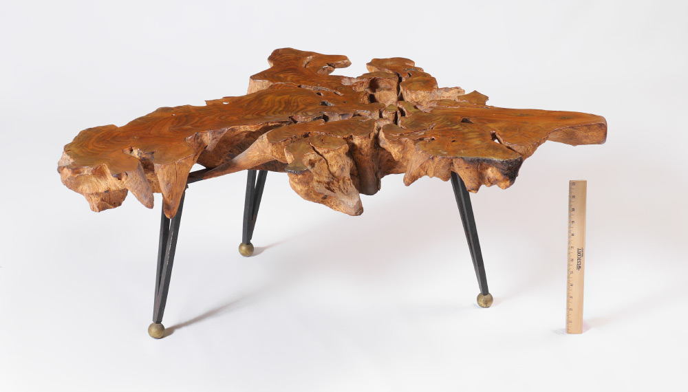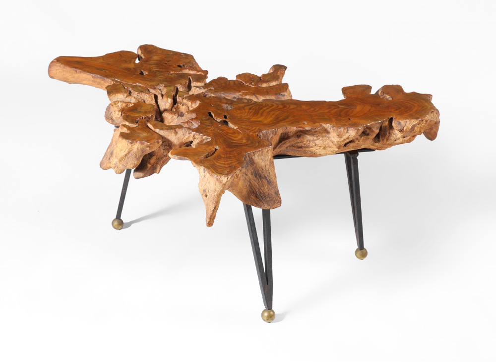 NATURAL ELM ROOT SIDE TABLE: In the manner of Carl Aubock, slice of elm root on steel legs, unmarked, measures 16 1/4'' h. x 37 1/2'' x 25 1/2''.