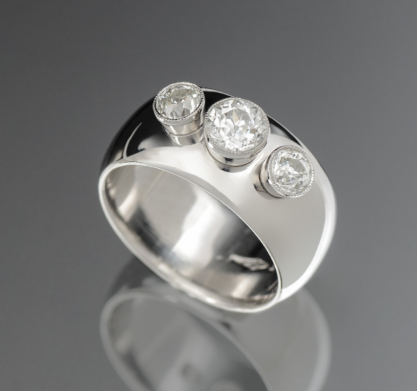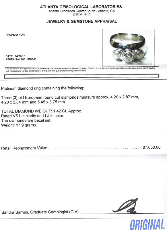 WIDE PLATINUM 3 STONE DIAMOND BAND RING: Three old European round cut diamonds totaling approx. 1.42 Ct., are rated VS1 in clarity and I-J color. The diamonds are tube bezel set with a touch of milgrain. Size 7. Width 9 mm. Weight 17.9 grams. Sold with current Atlanta Gemological GIA graduate's appraisal for $7,650.