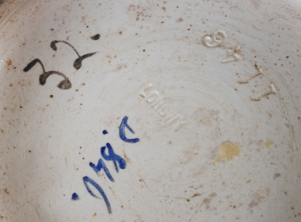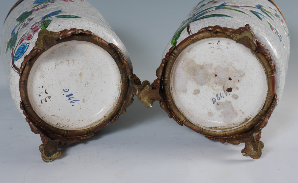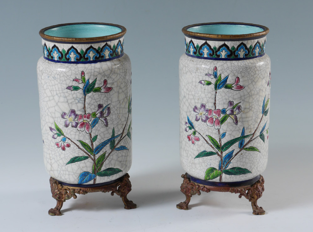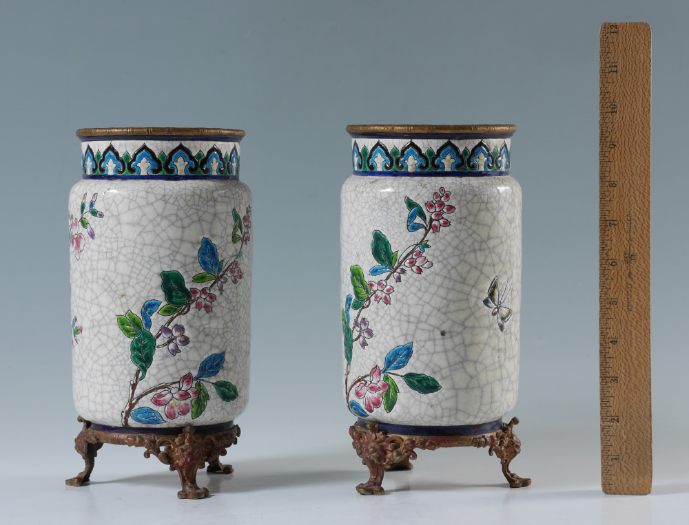 PAIR OF METAL MOUNTED FRENCH LONGWY VASES: Crackle glaze ground, incised floral and butterfly motif body. Metal mounted rim and base with 3 feet. Impressed Longwy and other marks on base. Each measures 9 1/2'' h. x 4 1/2''.