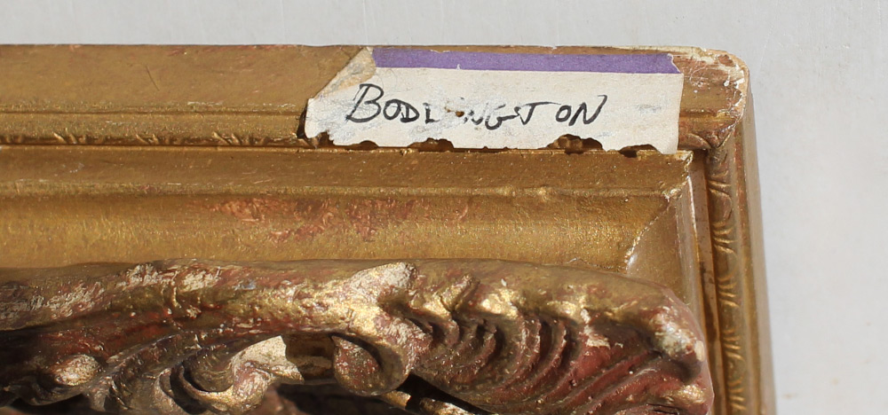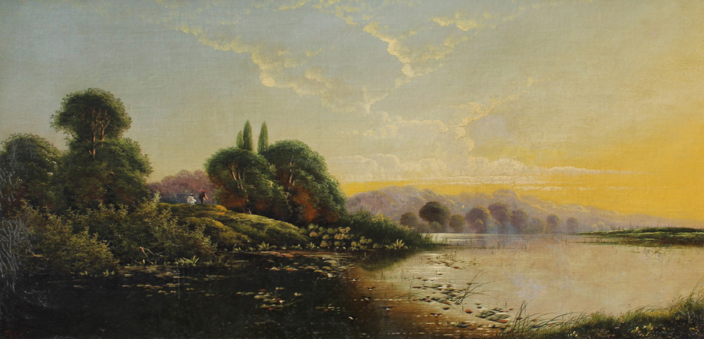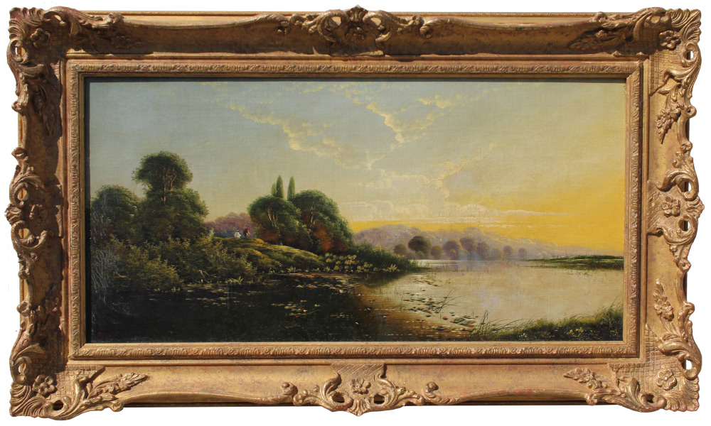 LATE 19TH C RIVER LANDSCAPE PAINTING BODINGTON?: Oil/Canvas, 12'' x 24'', monogramed lower left EHB possibly Edwin Henry Bodington, pierce carved and gilded gesso frame, 17.25'' x 29.25''.